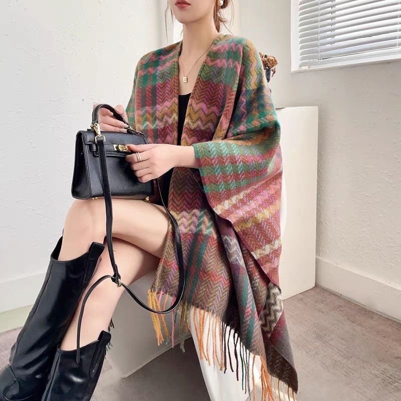 2025秋冬新款流苏披肩斗篷女士百搭千鸟格格子开衫大码披风围巾