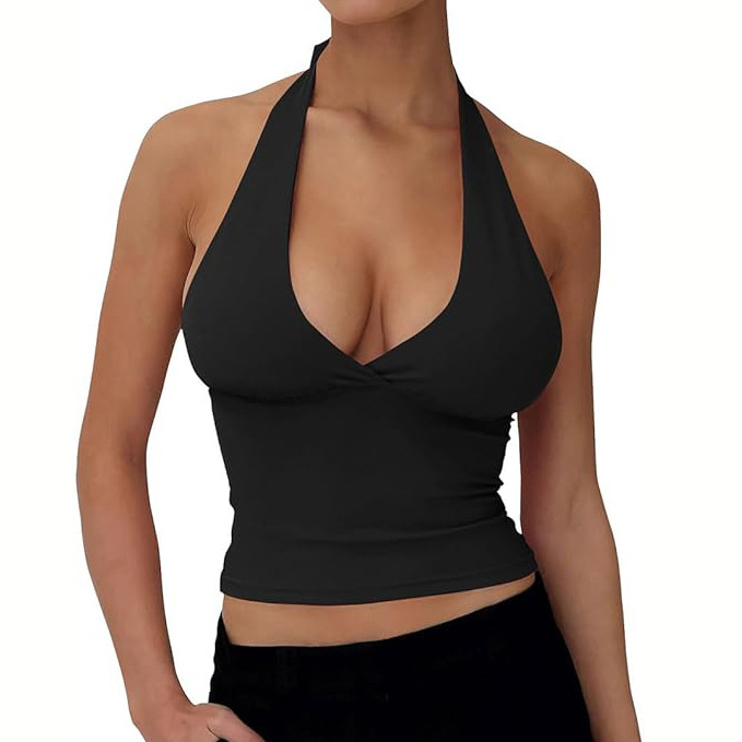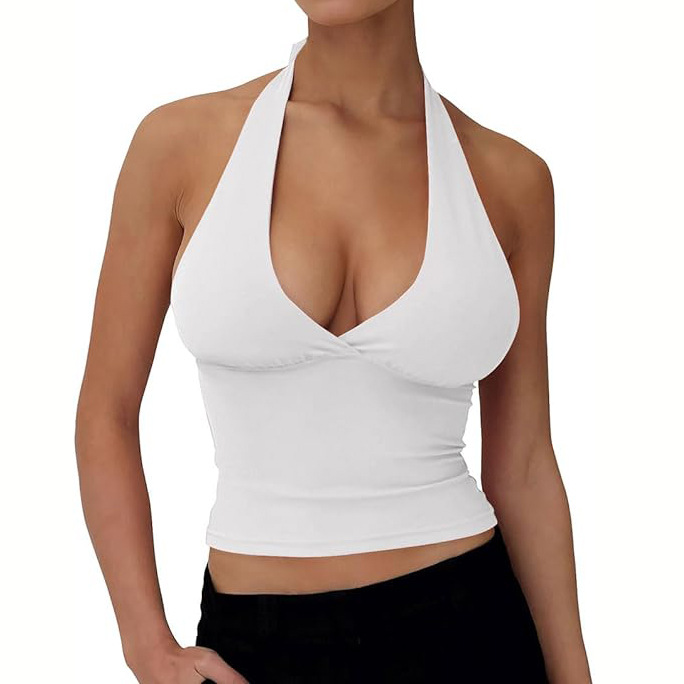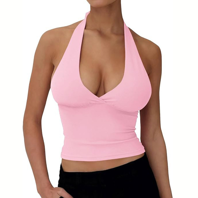 现货辣妹纯欲V领挂脖背心低胸带胸垫修身显瘦收腰露背吊带女上衣