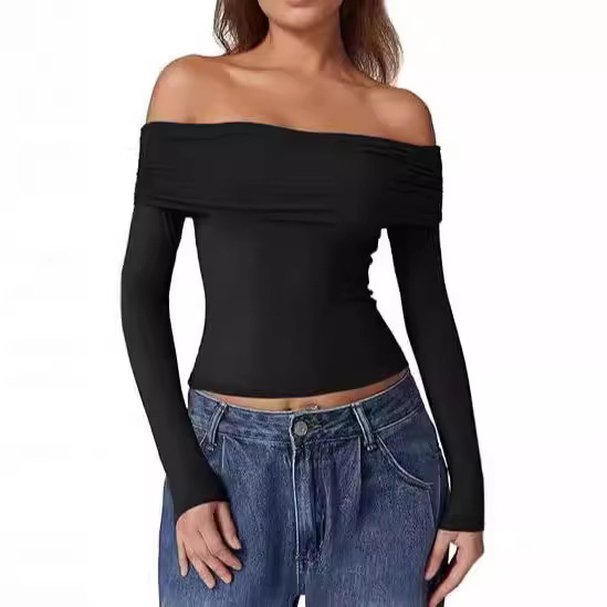 クロスボーダー欧米風婦人服トップス 秋用インナーシャツ レディース 高級感 ラウンドネック 長袖 プルオーバー スリムフィット おへそ出し