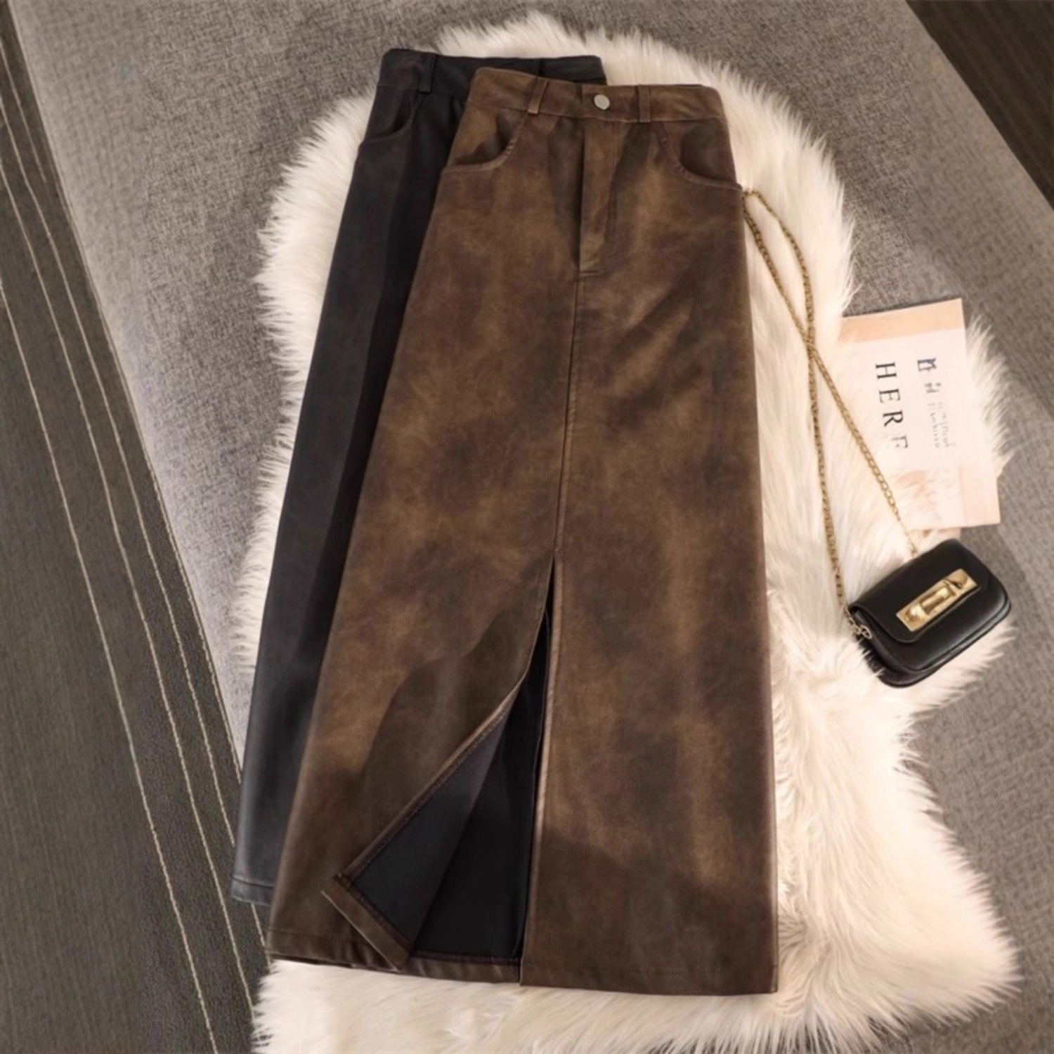 美拉德棕色复古皮裙女秋冬高腰包臀裙显瘦中长款开叉a字半身裙子