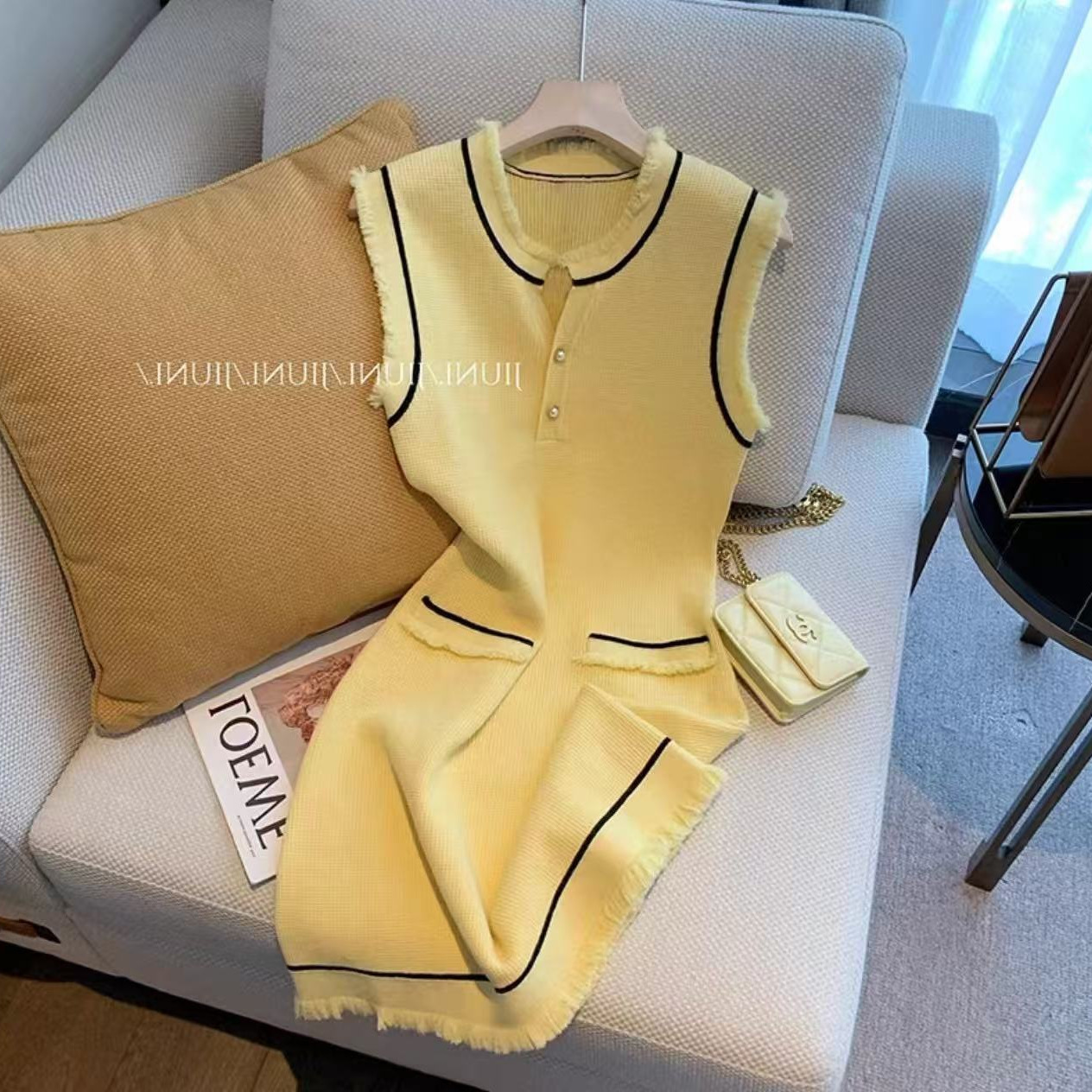 高級感黄色小香風ノースリーブワンピース女性2025春夏新作シック着痩せスカートins