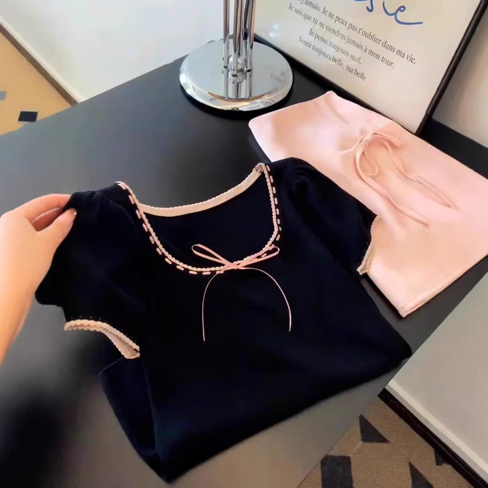 春夏独特のユニークな蝶結び半袖ニットtシャツの女性デザイン感があります。