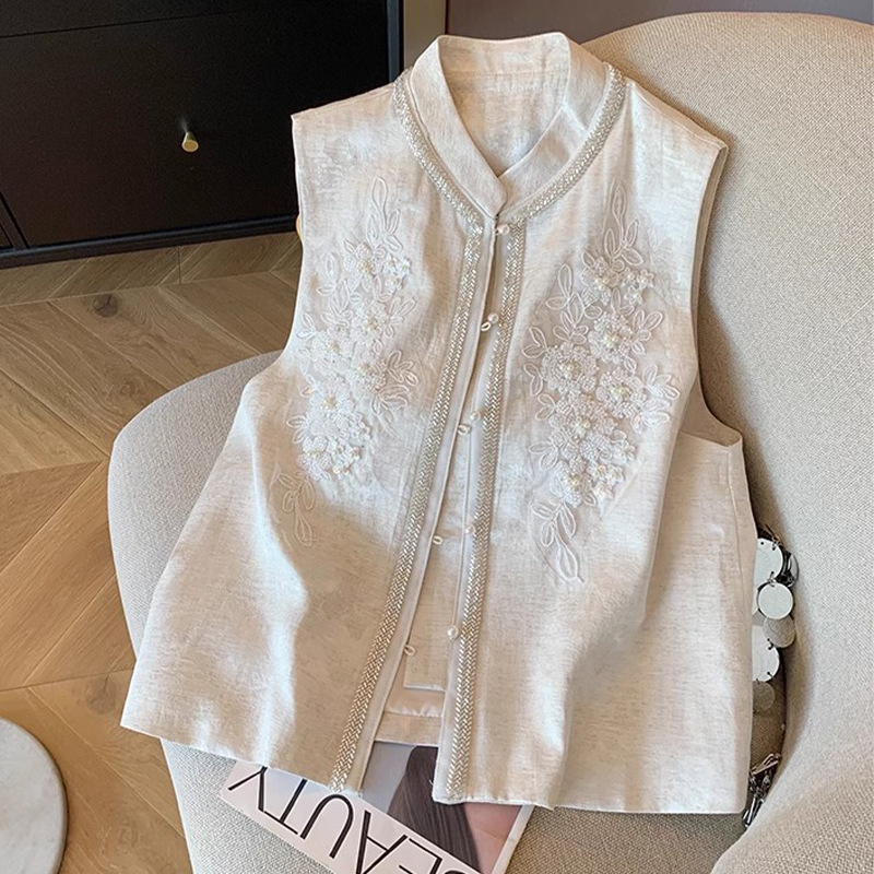 重工釘珠刺繍新中国式馬甲女2025夏の新型国風高級感気質立襟ベスト