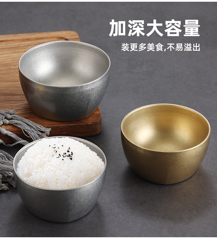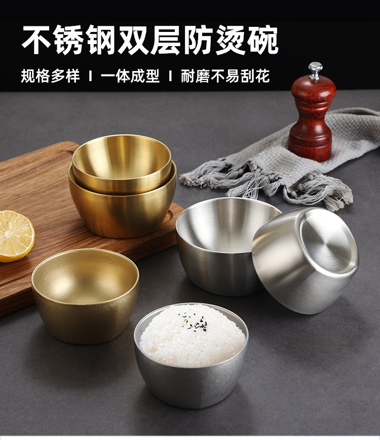 韓国式304ステンレスのご飯の碗の二重の熱いスープの碗の子供の食事の碗の商用の金色の料理のキムチの碗