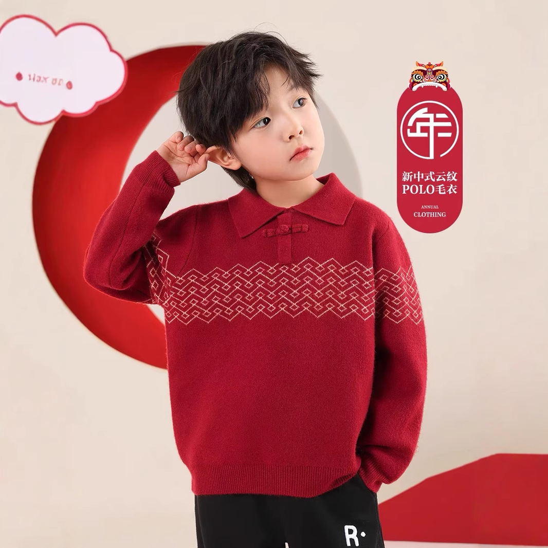 男の子の赤いセーターの子供のpo 0ニットの秋冬の新型の中で大きい子供の上着の赤ちゃんの新年の服の国風