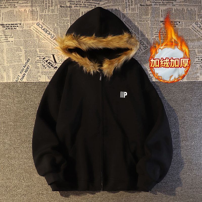 アメリカのレトロなファッションブランドの毛の襟のファスナーのカーディガンと帽子のパーカーの女性の秋冬のカップルの高級感のカジュアルなコートのファッション