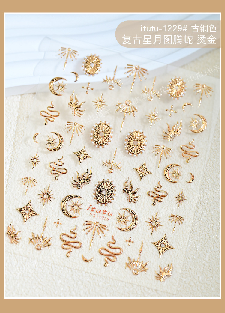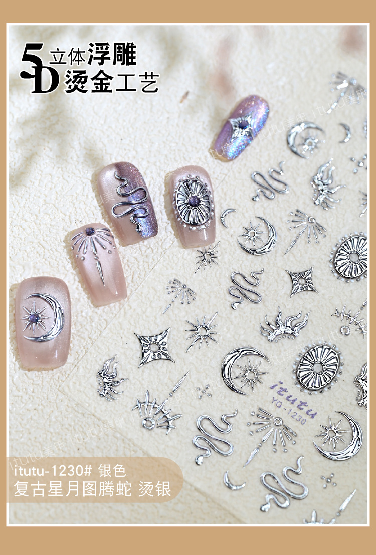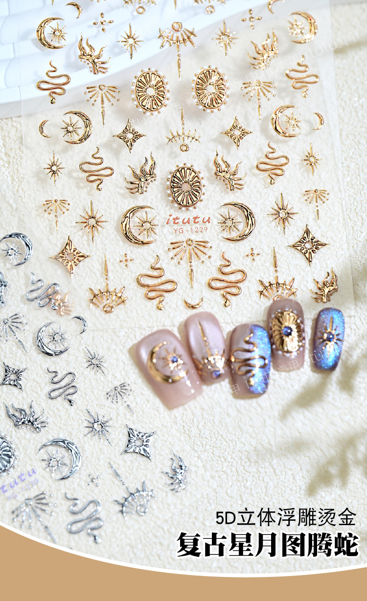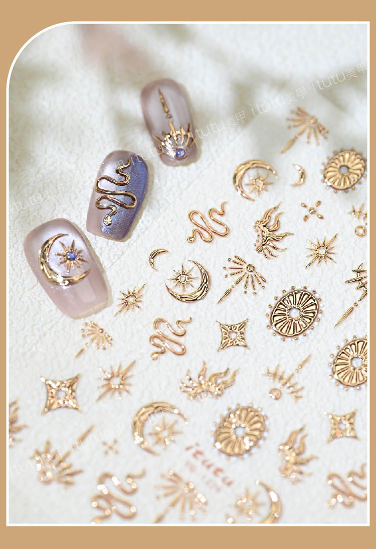 itutu新款复古星月图腾蛇5D立体烫金美甲贴浮雕指甲贴花背胶1229