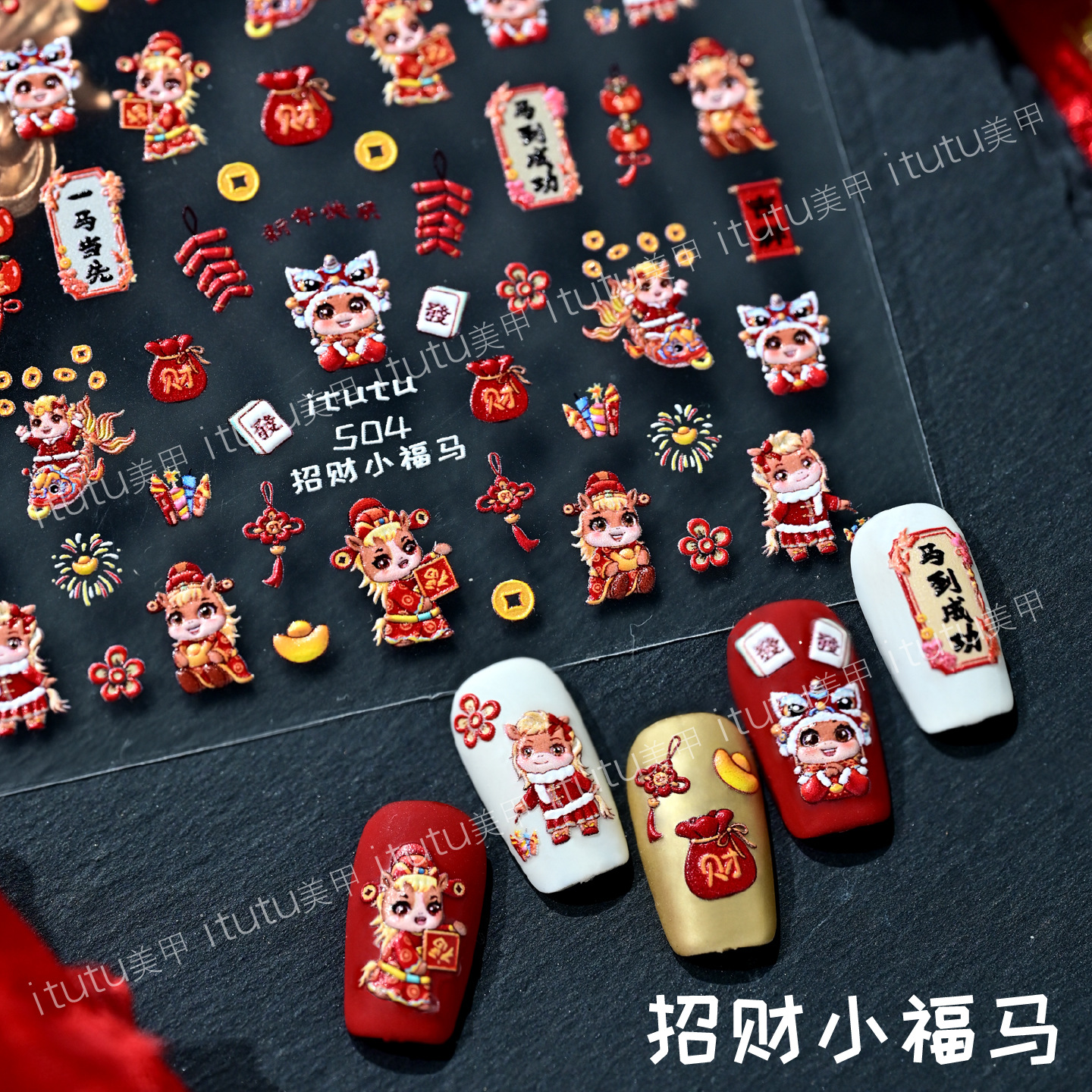 itutu新款招财小福马浮雕美甲贴纸新年马年指尖小图案背胶贴纸504