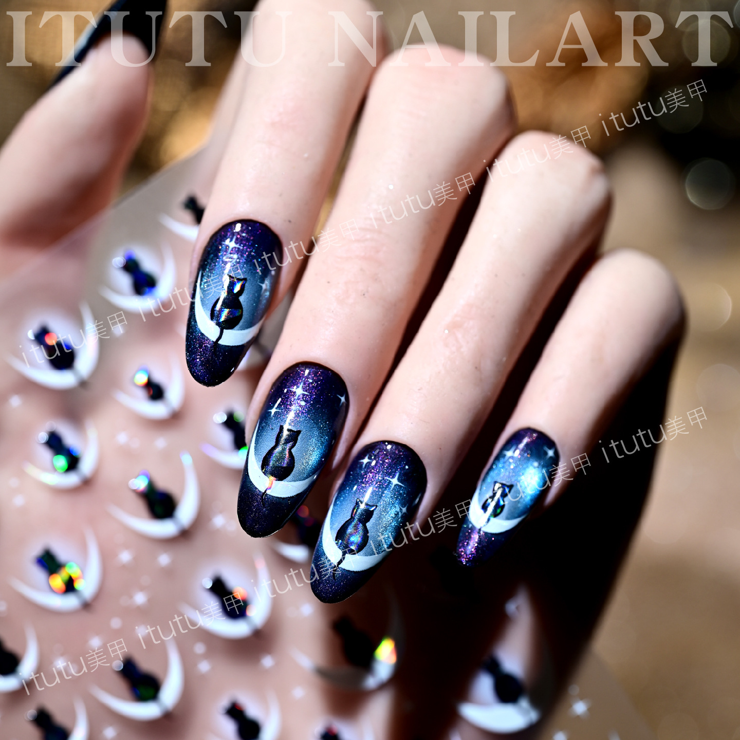 itutu新款月色猫影贝壳光美甲贴纸四芒星黑猫猫咪月亮背胶贴1304