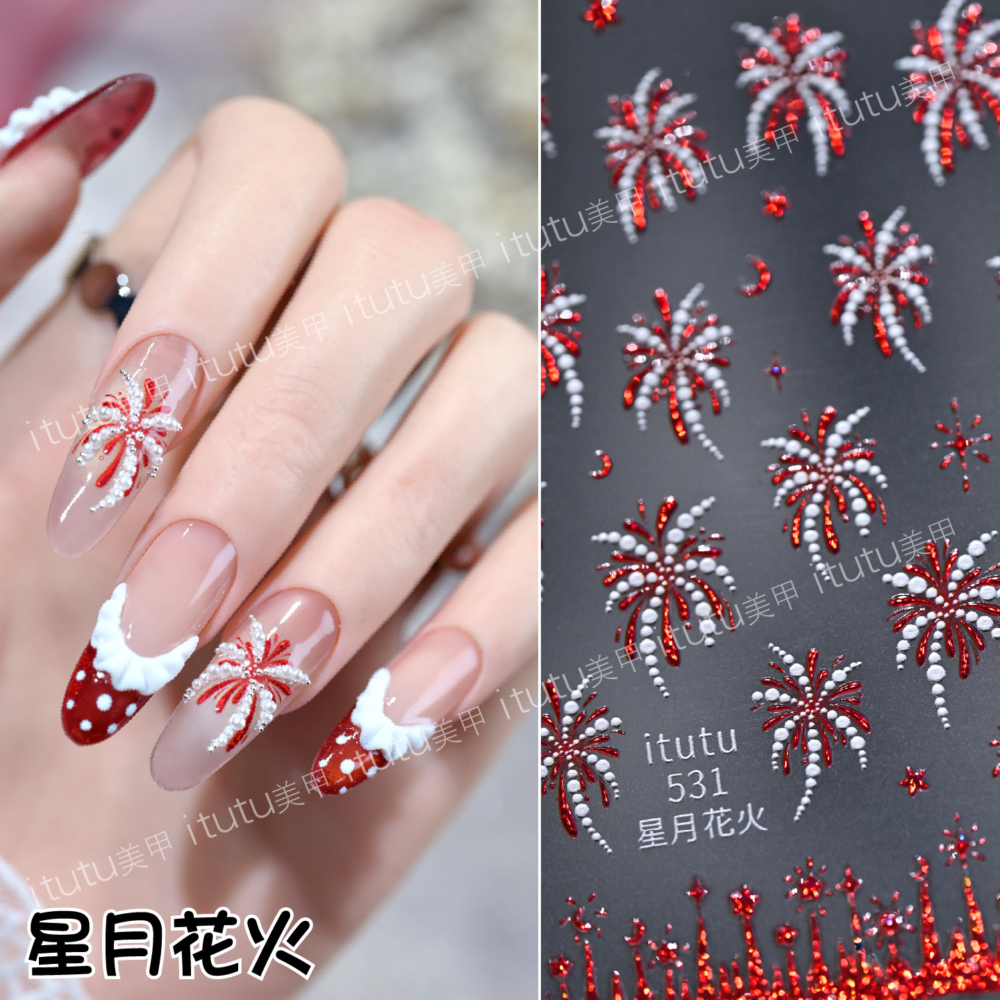 itutu新款星月花火浮雕美甲贴纸爆闪烟花镭射指尖元素背胶531幻彩