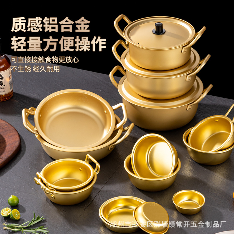 韓国式の黄色のアルミニウムの泡の鍋のラーメンの鍋のアルミニウムのスープの鍋のホテルのレストランの金色のラーメンの鍋の双耳は蓋の小さい鍋を持っています。