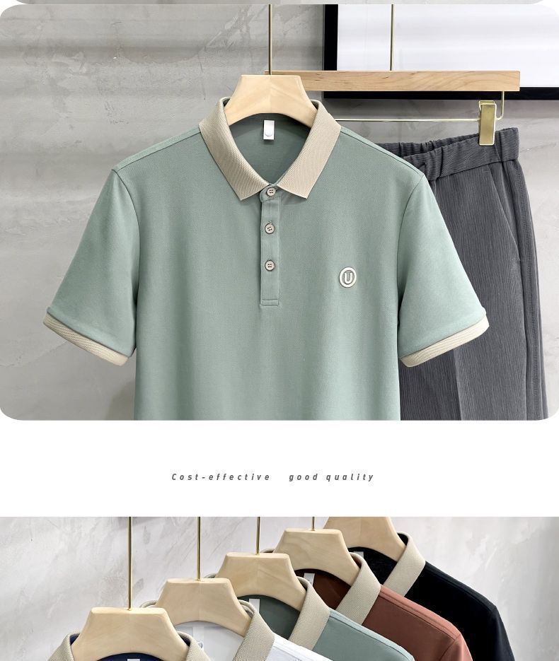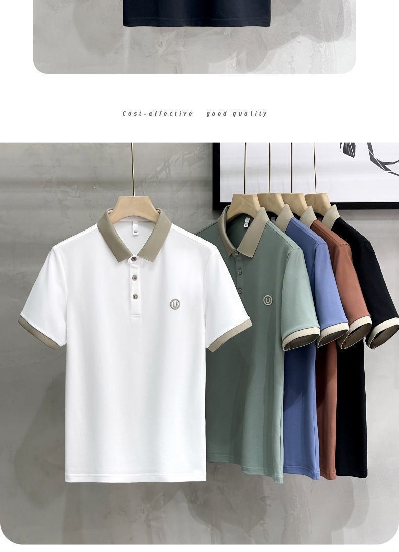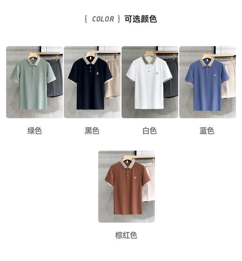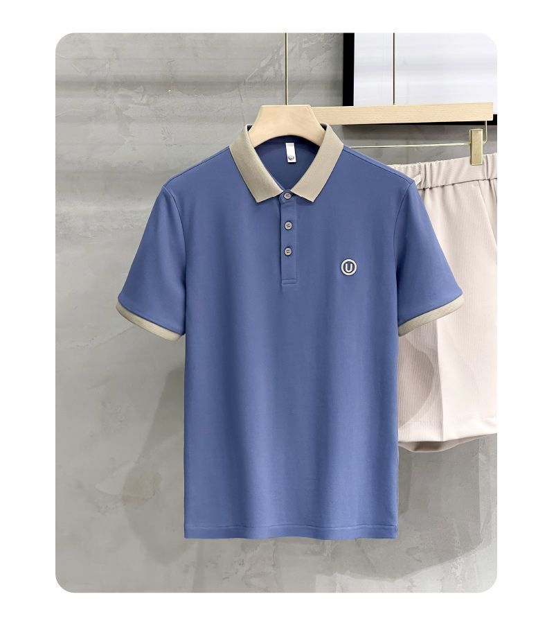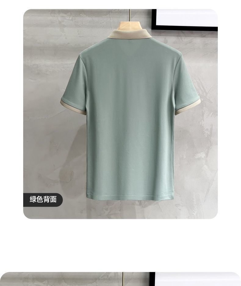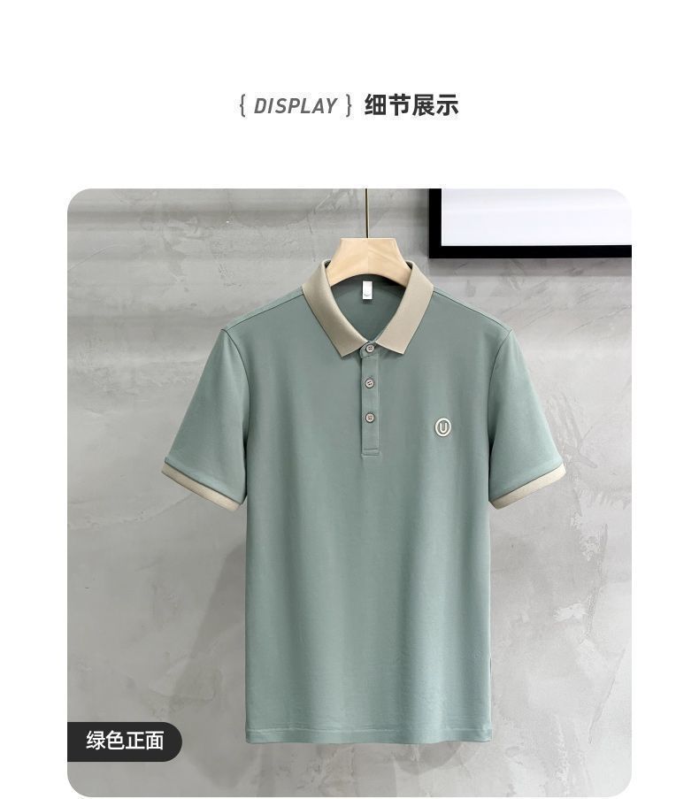 2025夏の氷糸純色刺繍poloシャツ英倫男性修身半袖衝突色襟tシャツ上着
