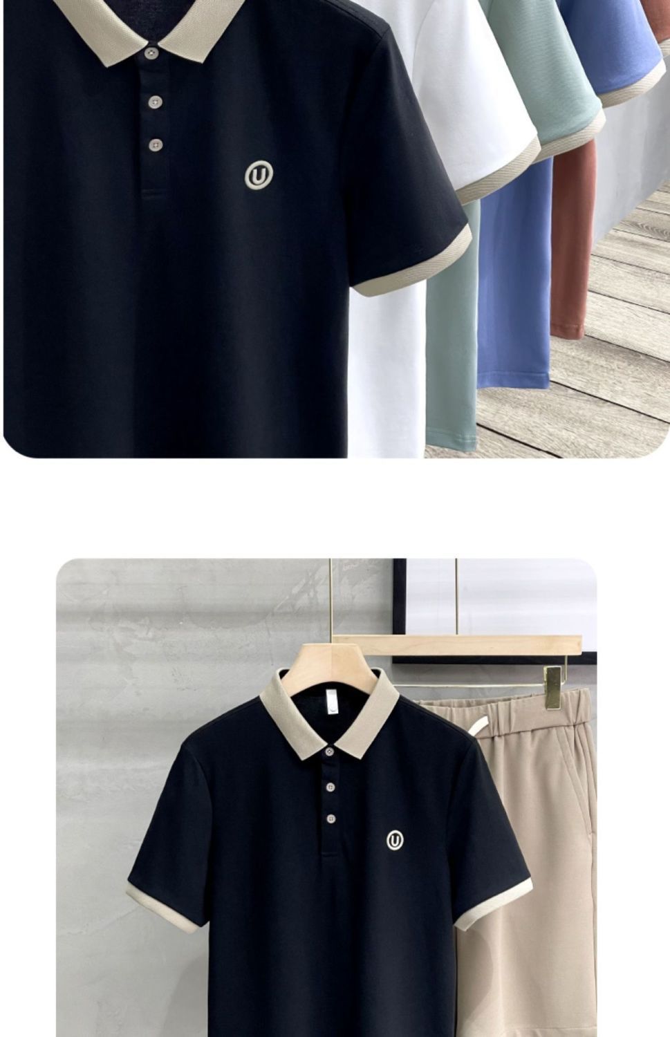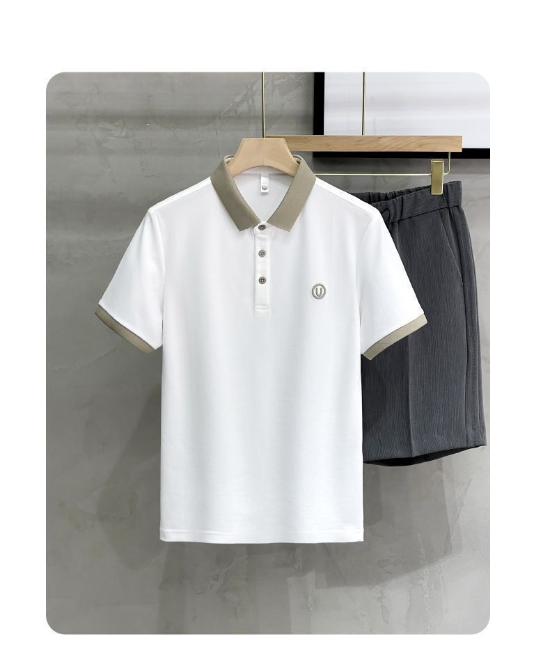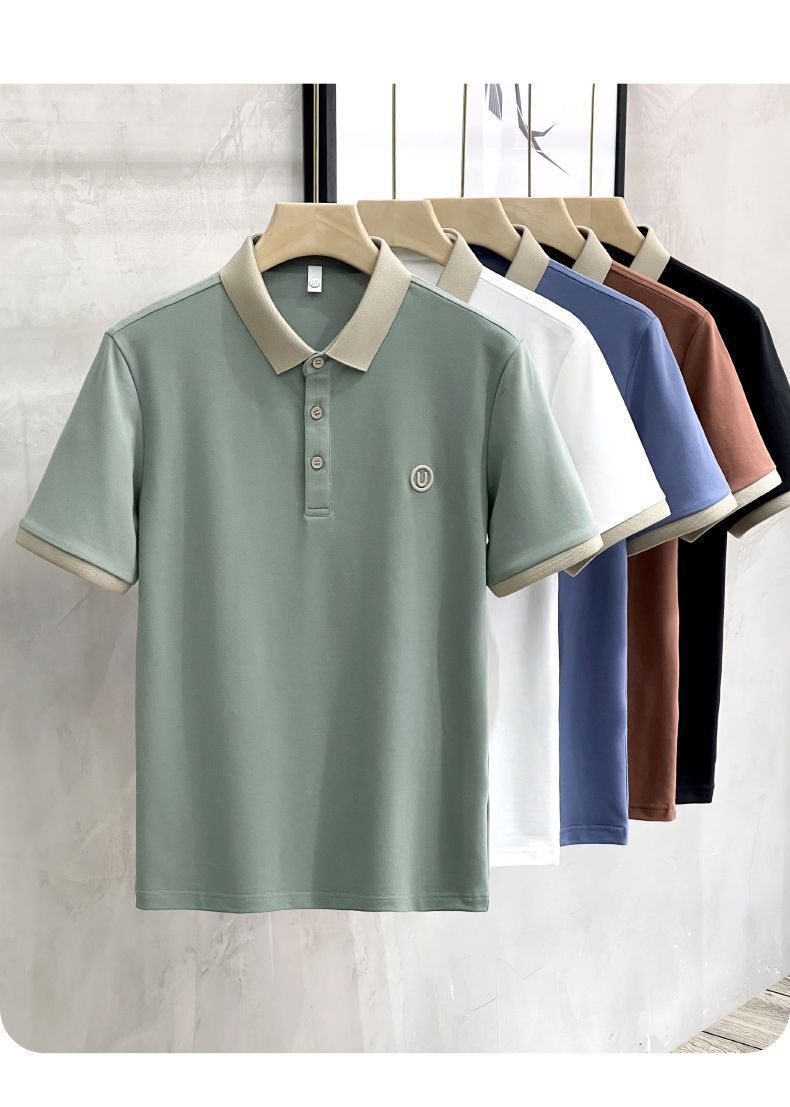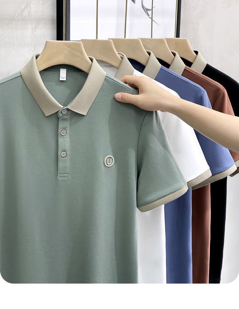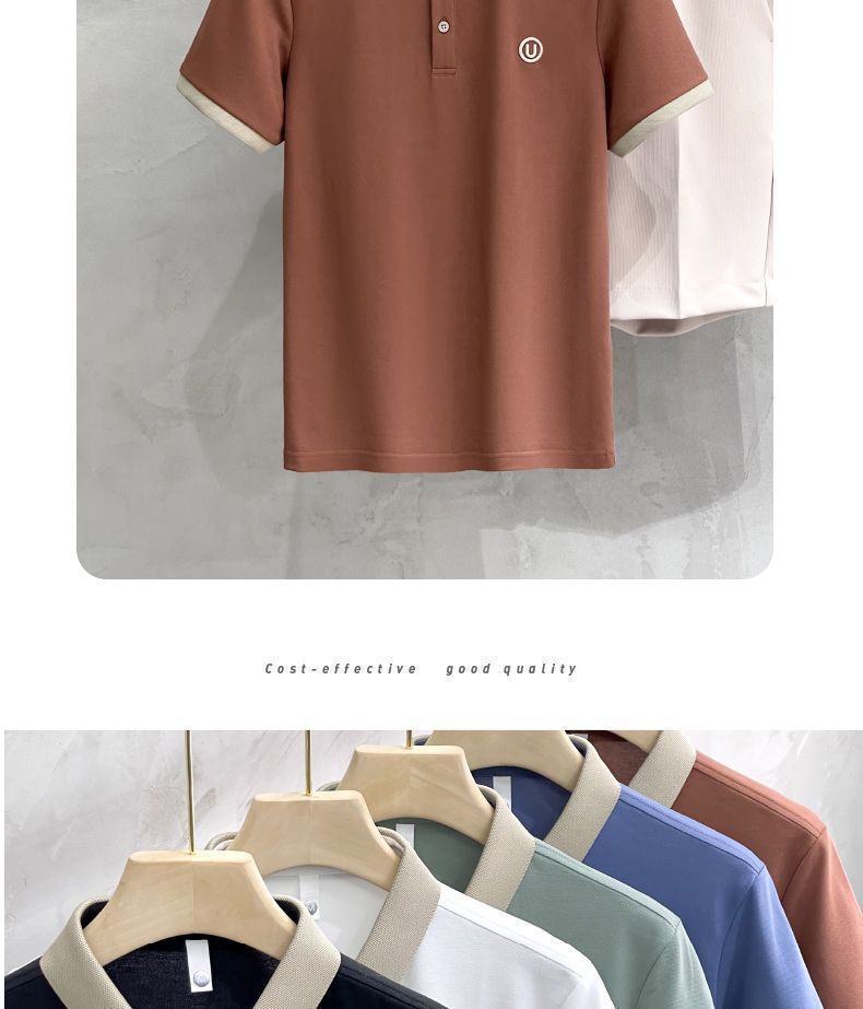 2025夏の氷糸純色刺繍poloシャツ英倫男性修身半袖衝突色襟tシャツ上着