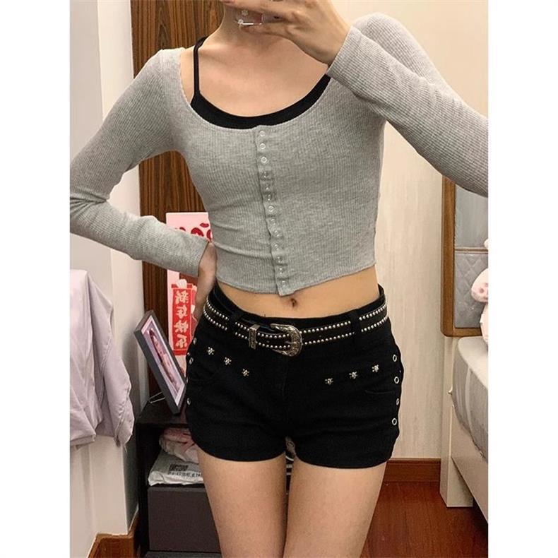 黒リベット低腰デニムショートパンツ女性新アメリカギャル弾力ガードル痩せa字広脚亜文化