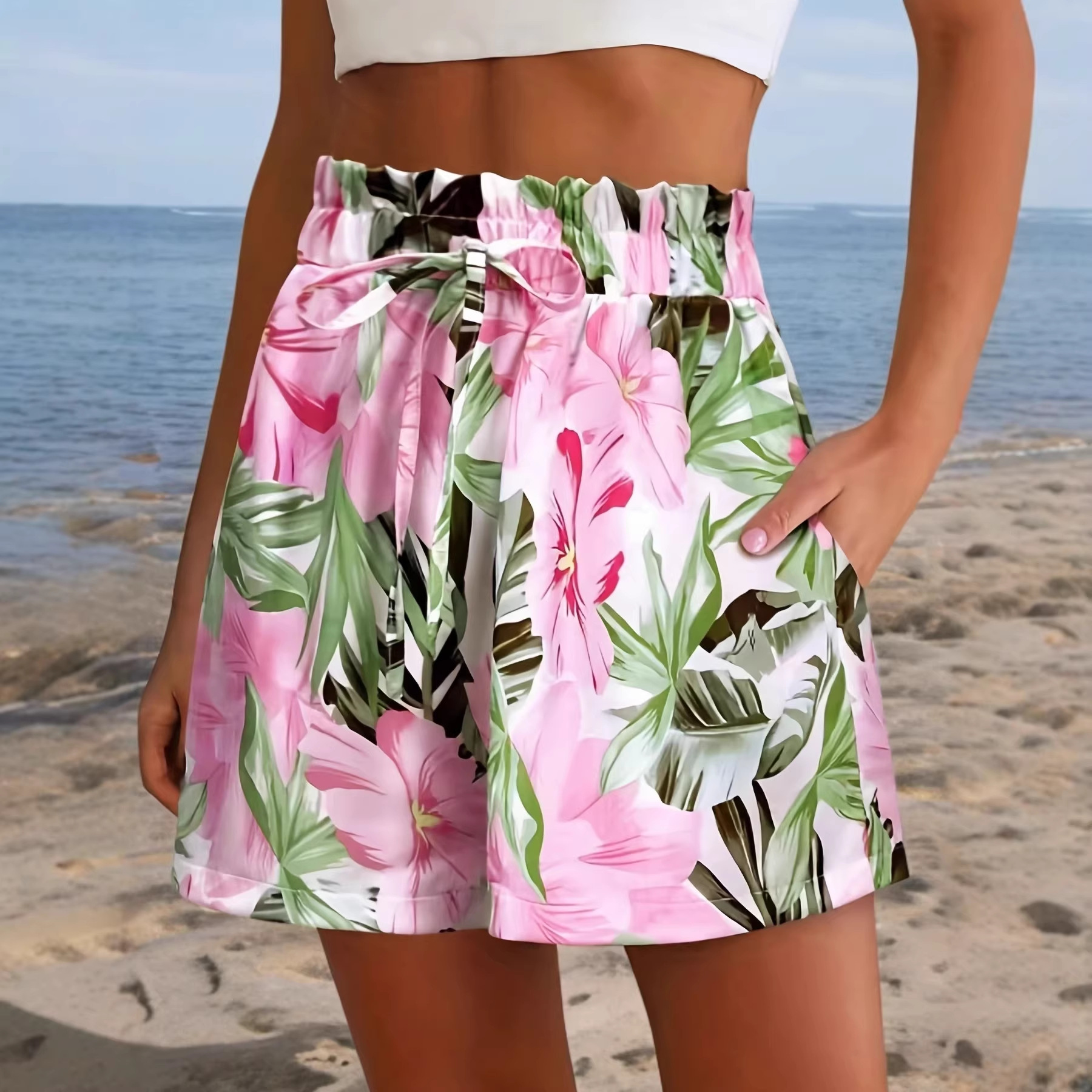 2026亚马逊女式跨境热带休闲度假简约时尚高腰户外花朵印花短裤