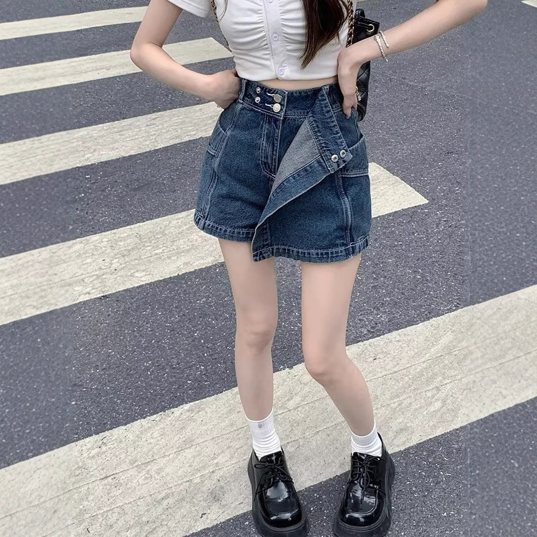 Aラインデニムキュロットレディースキュロット、ヒップカバー不規則、夏のホットガールハーフレングス、小柄、ハイウエスト、スリム、露出防止