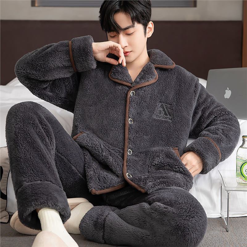 5A抗菌冬季睡衣男士新款加绒加厚珊瑚绒中青年法兰绒家居服开衫大