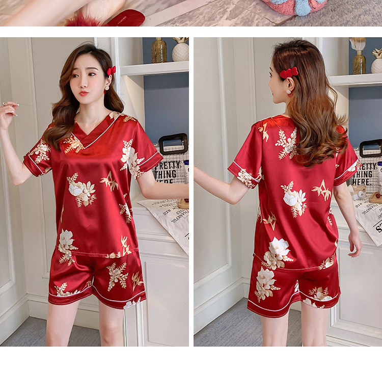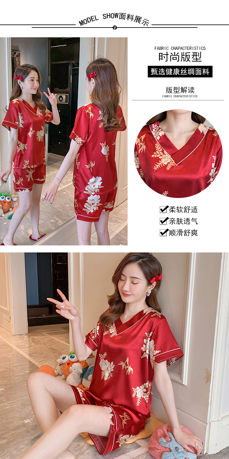 パジャマの女性の夏のvネックの半袖の氷の糸の薄い金のネットの赤い風の夏の大きいサイズのシルクの2つのセットは夏のシルクを詰めます。
