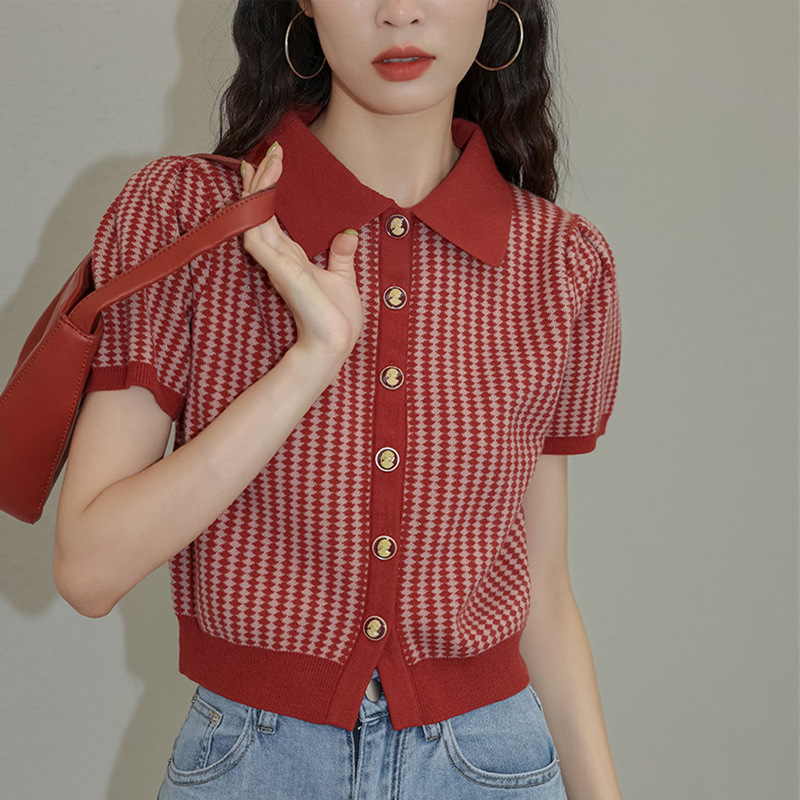 レトロな赤い菱格の泡の袖のニットの上着の女性の夏のフランス式は色のPoloの襟の薄い半袖の気質の小さいシャツにぶつかります。