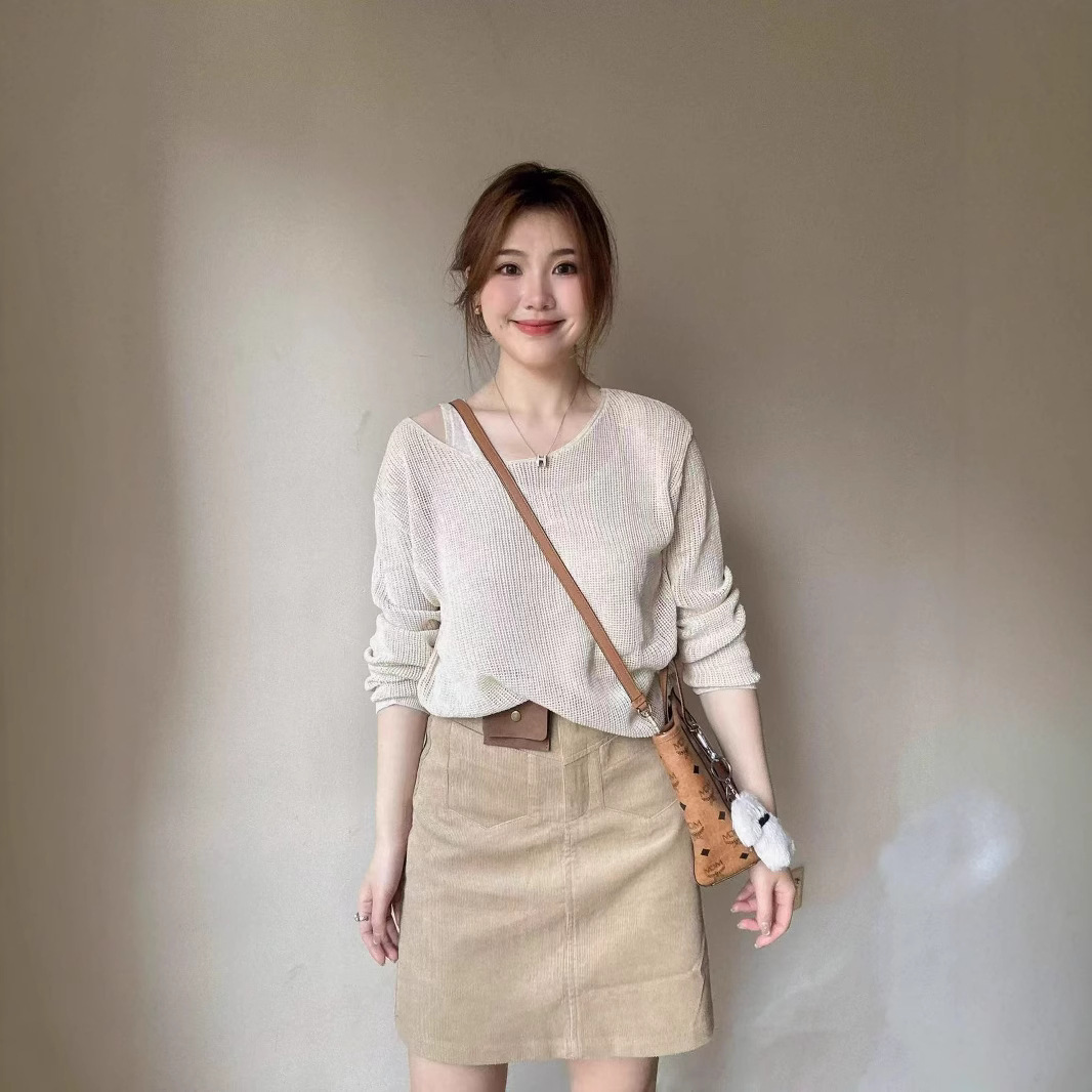 灰色の長袖の純色の斜め肩のニットの女性2025早春の新型の修身のセーターはやせています。