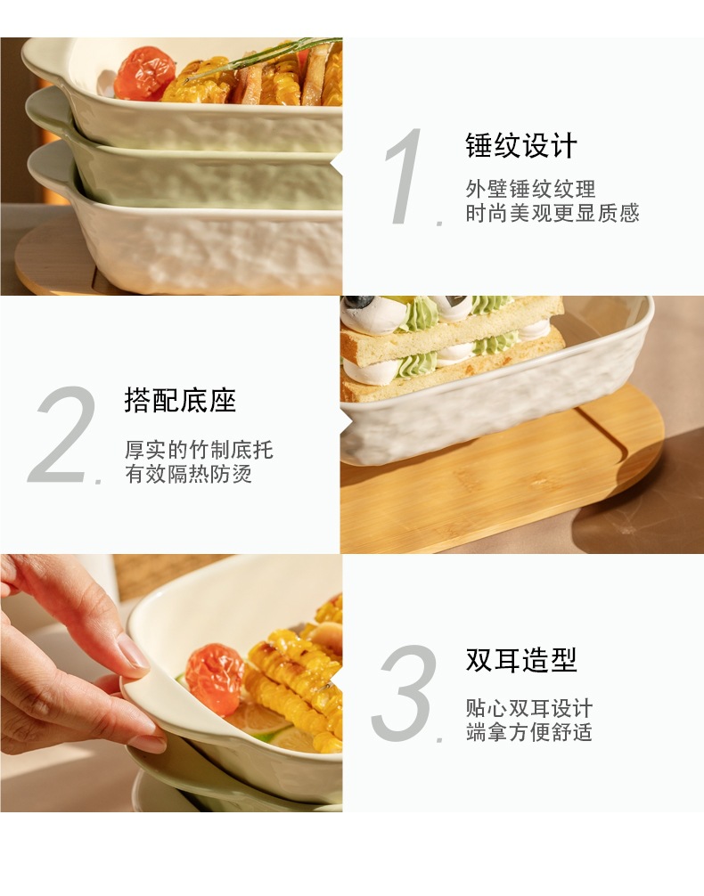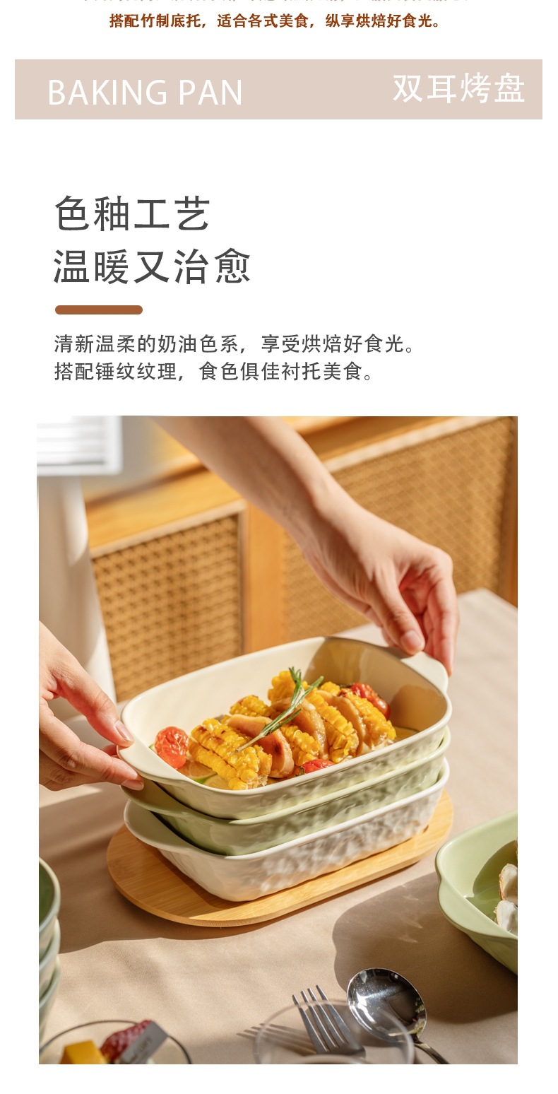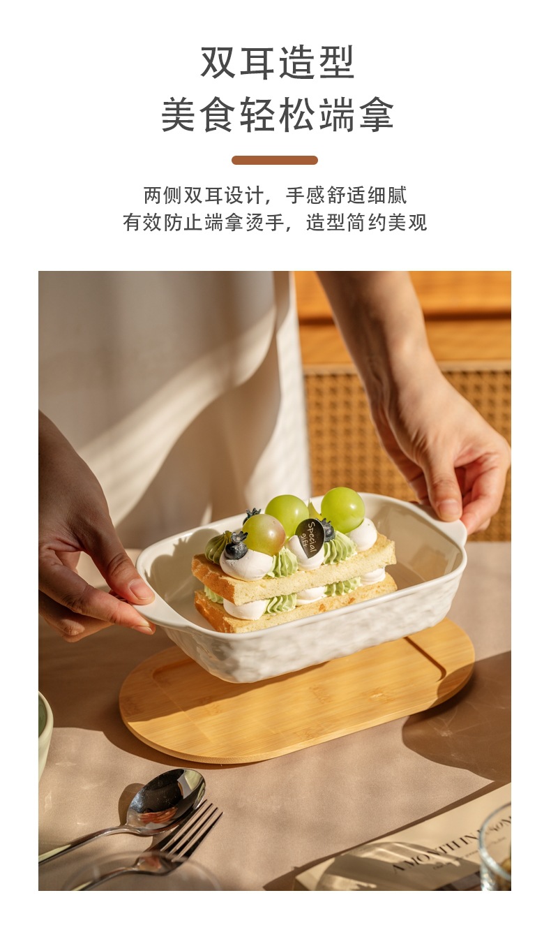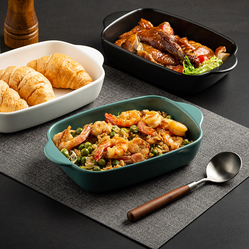 焼き皿陶磁器長方形電気オーブンチーズグラタン皿家庭用両耳焼き碗の簡単版は硬くて壊れにくいです。