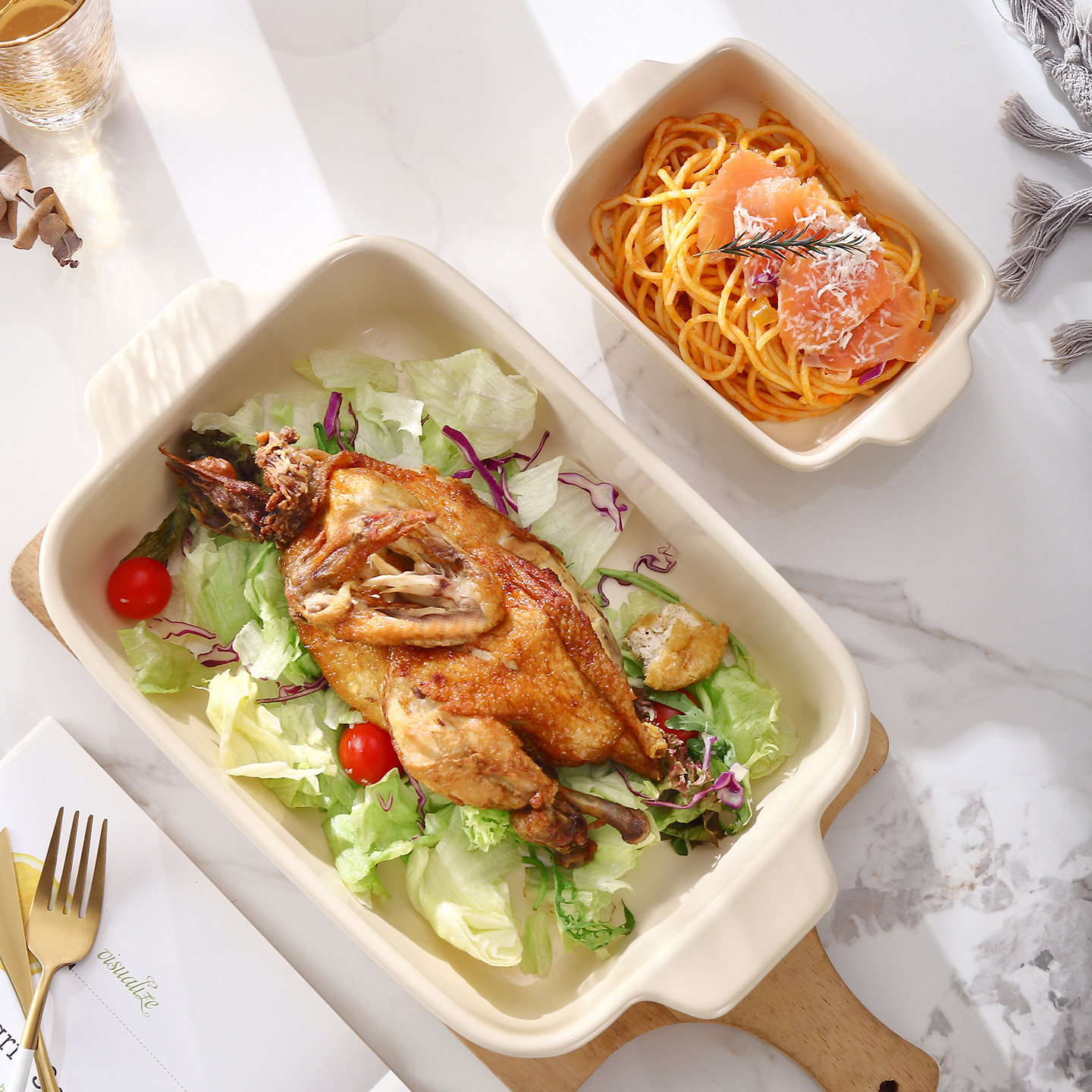 クリーム色のセラミック製オーブン用ベーキングトレイ、家庭用皿、サラダボウル、長方形チーズ焼き飯皿、食器