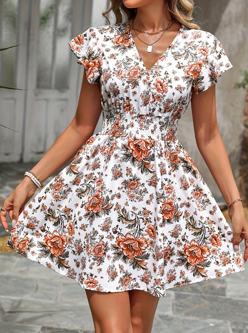 2025欧米のフランス式の花のプリントの蝶々の袖のA字のワンピース