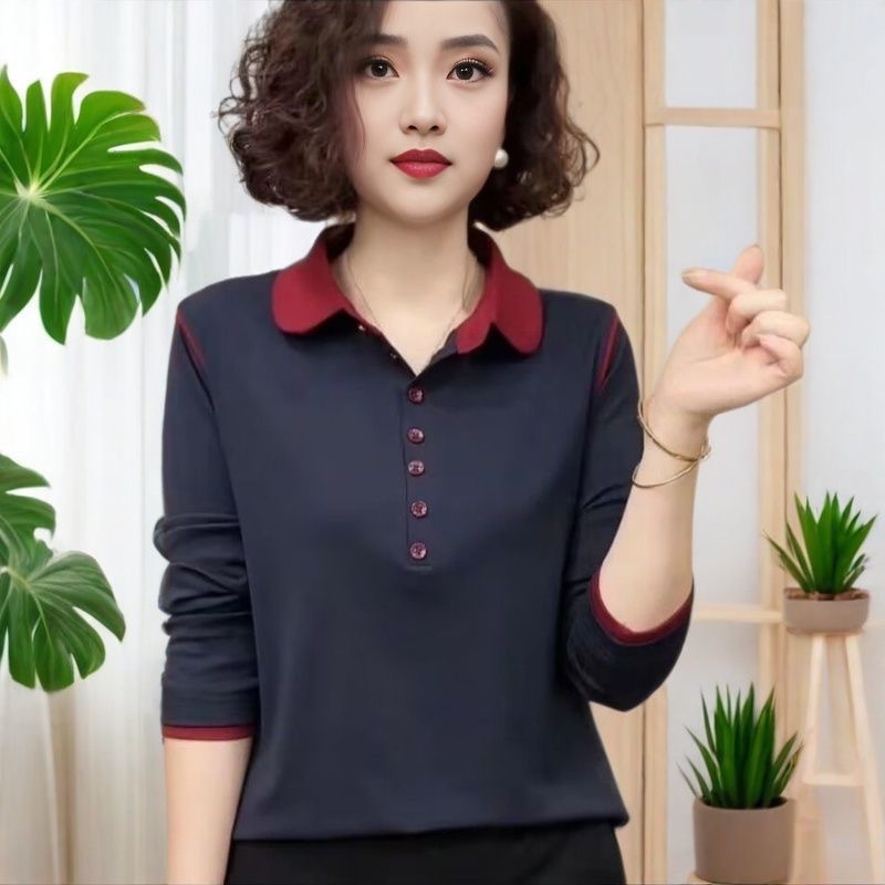 生放送で爆発したのは2025春と秋の新型の衝突色の襟の長袖のシャツの純色の簡単な組み合わせの中年の女性のtシャツです。