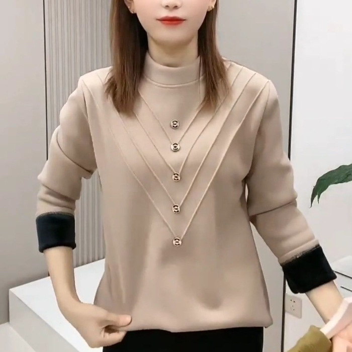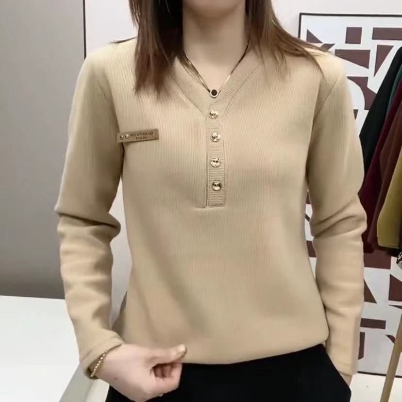 2024冬にベルベットを厚くしてvネックのシャツを着た女性の新しい洋気保温シャツがゆったりしてお腹が痩せている上着T