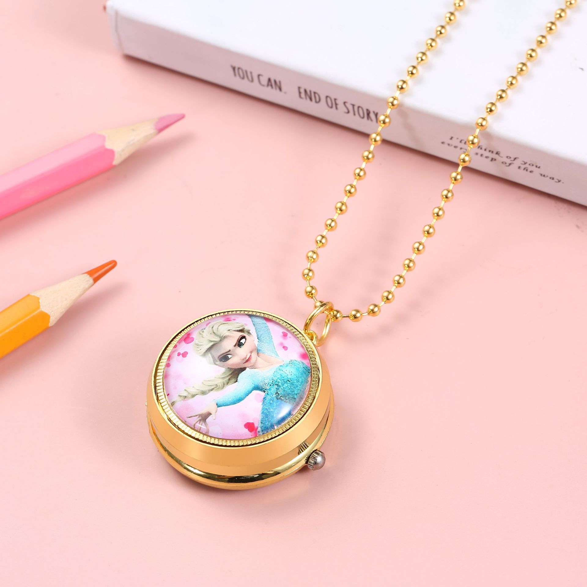 人気アニメ回転時計ネックレス時計子供懐中時計kt猫雪氷奇縁白雪姫ジャイロ回転時計工場