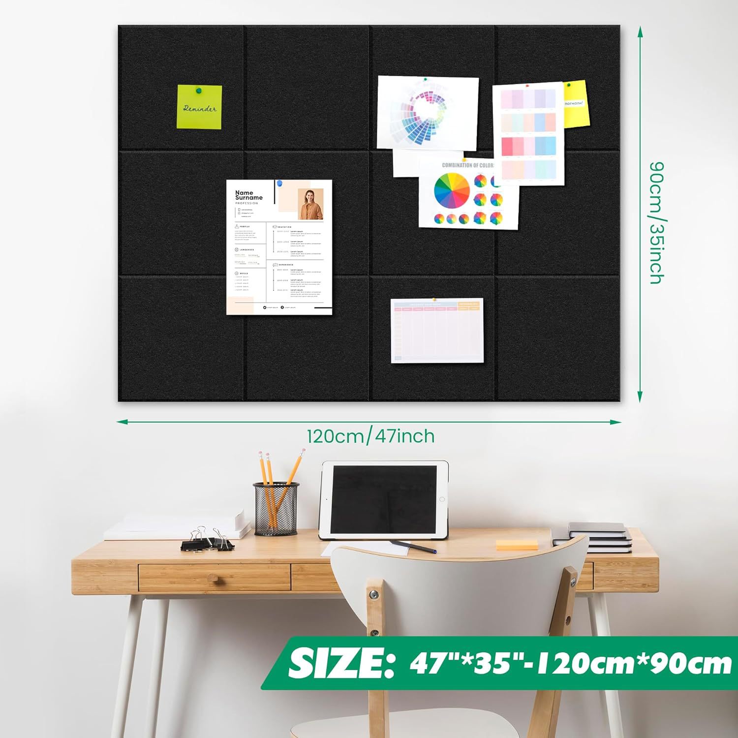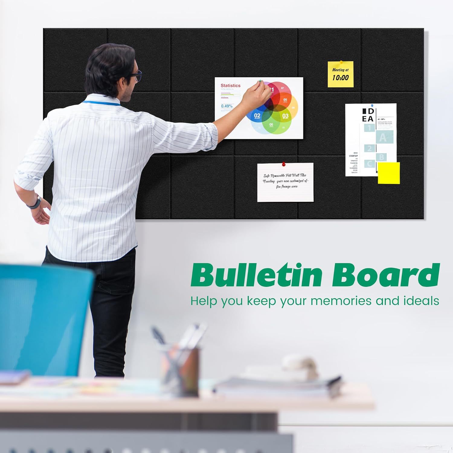 現代のシンプルなフェルトの壁に写真を貼って、掲示板の幼稚園の作品を展示します。