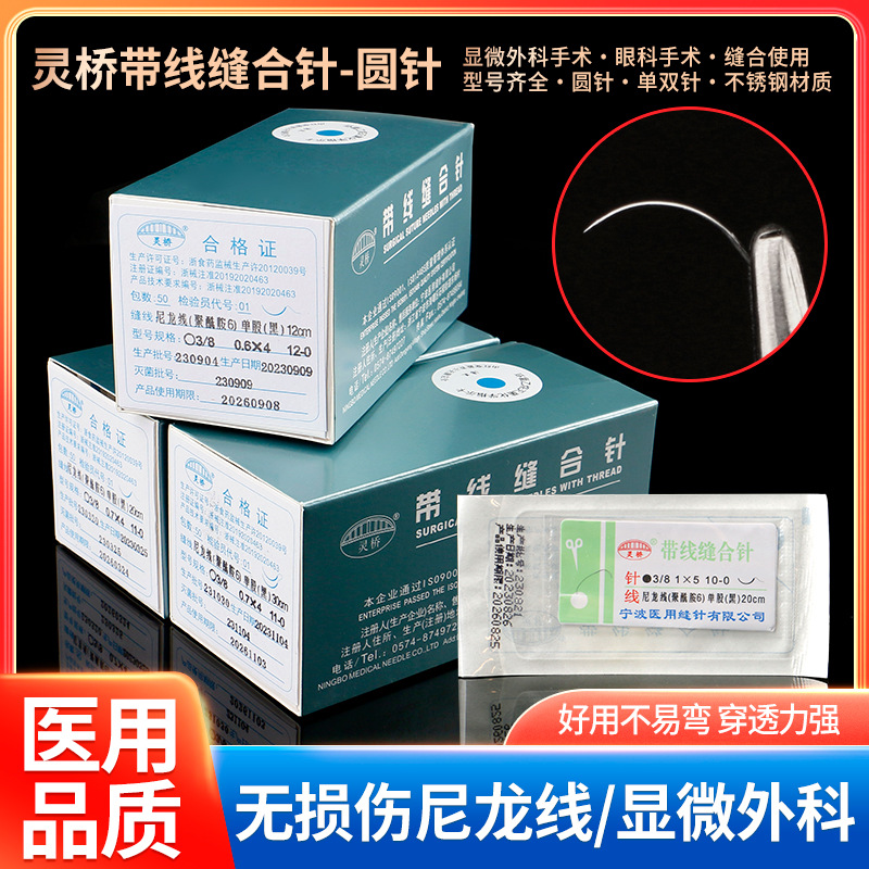 霊橋帯針縫合線丸針ナイロン糸医療用7/8/10/11/12-0顕微外科手術縫合線