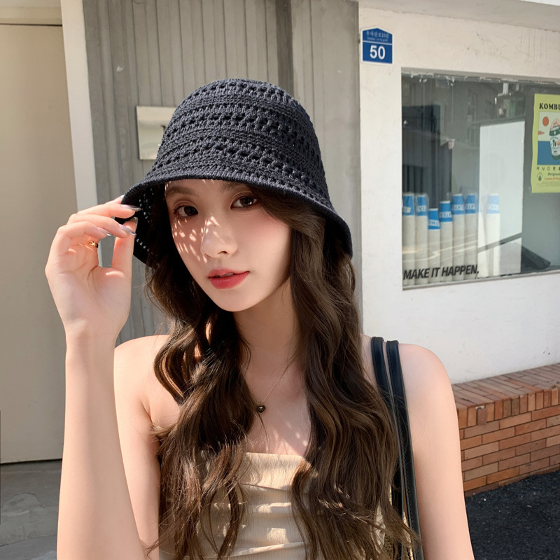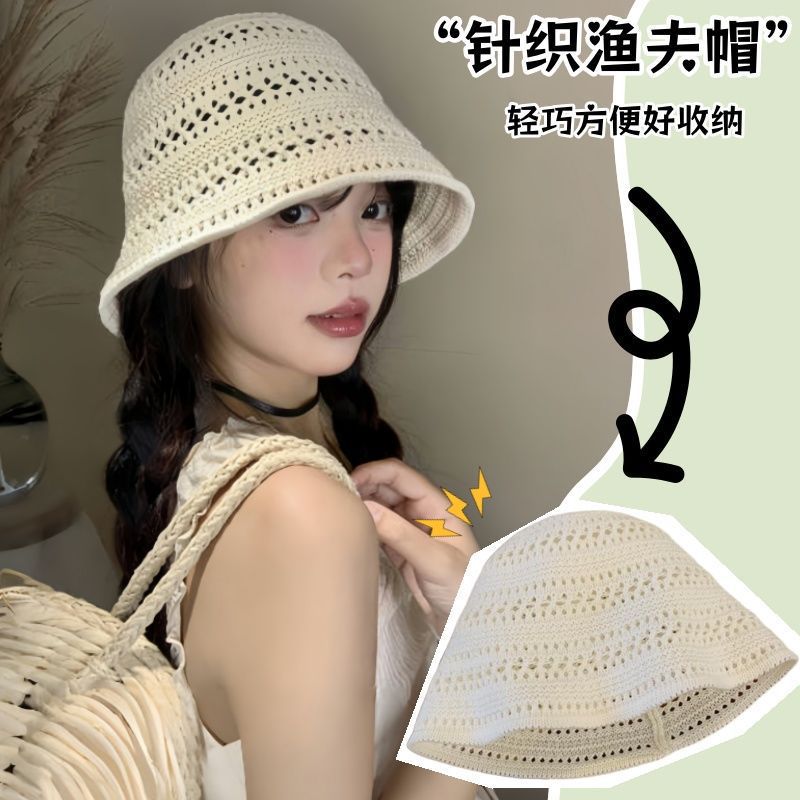 日本のニットの透かし彫りの漁師の帽子の女性の夏2025新型の通気性の日よけの日よけの帽子のバケツのたらいの帽子の太陽の帽子