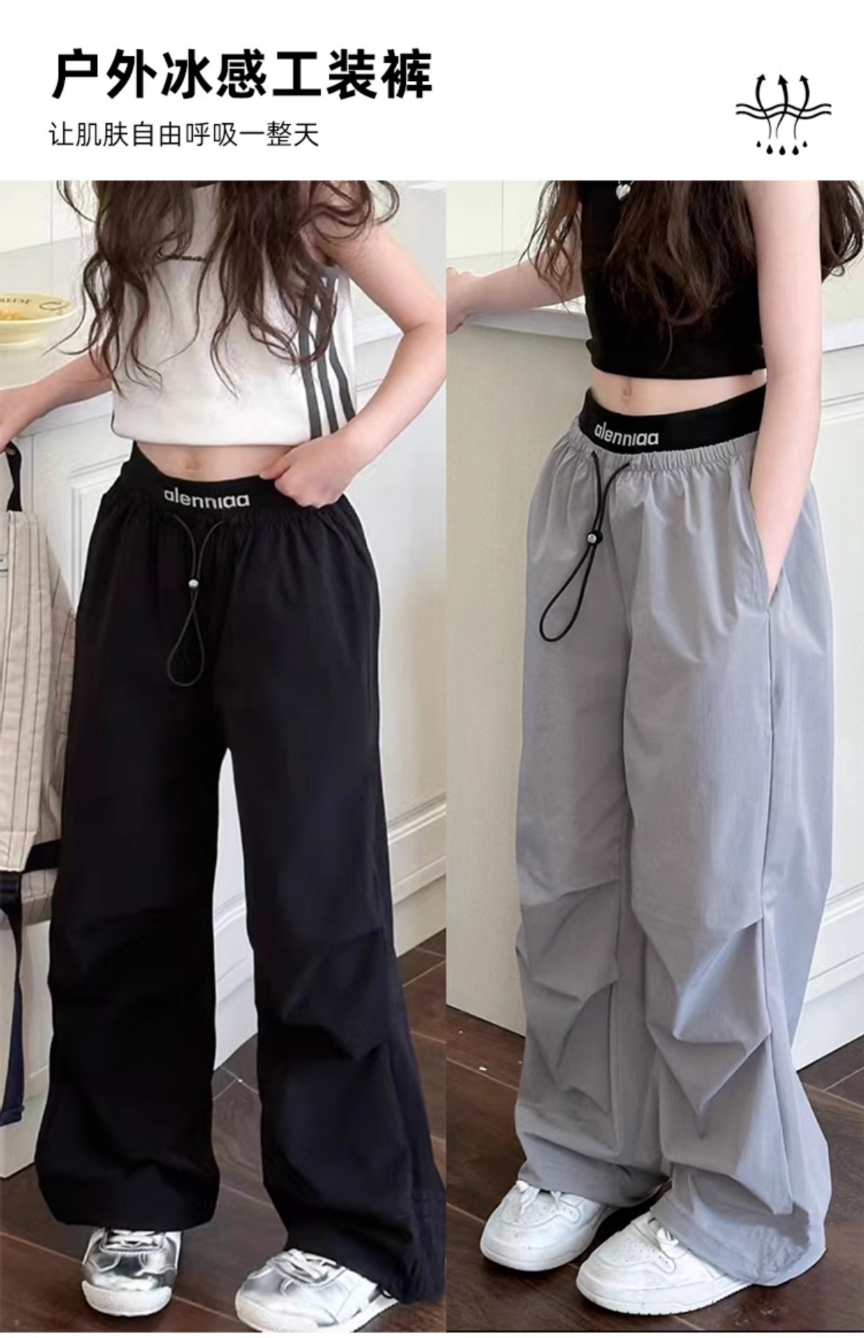 女の子の服装のズボンの夏の薄いタイプのズボンの2025年の新型の大きい子供の広い足のズボンの子供の春の夏のレジャーのズボン