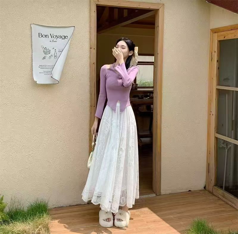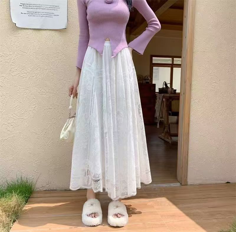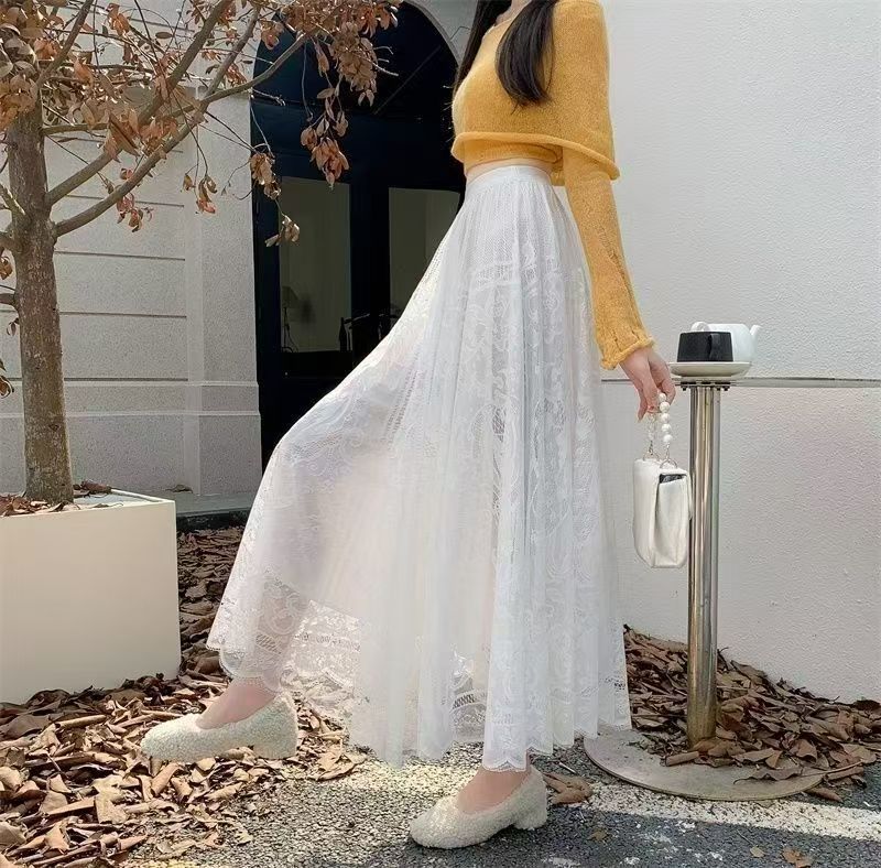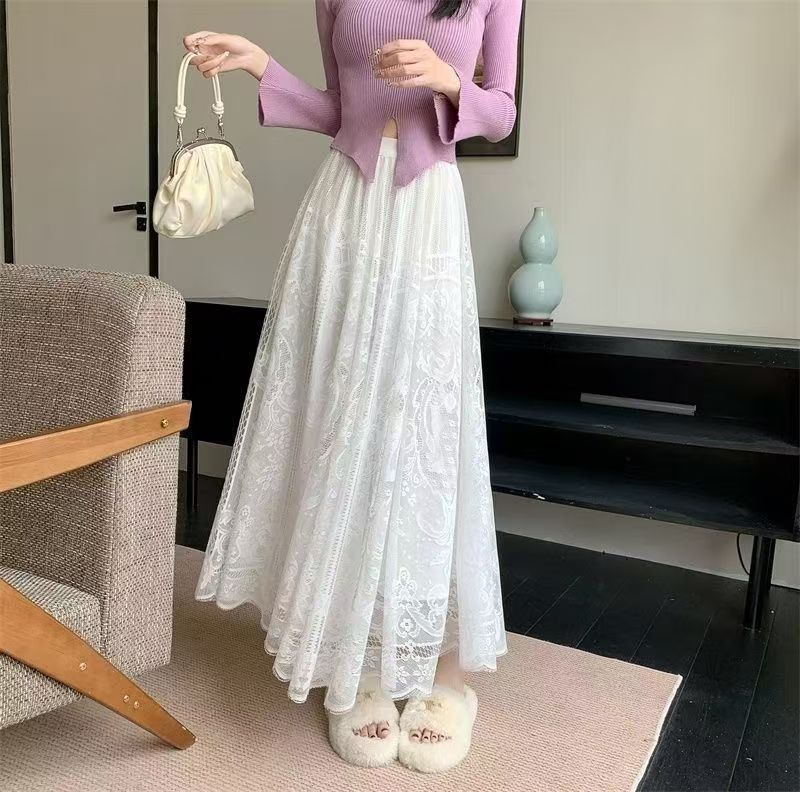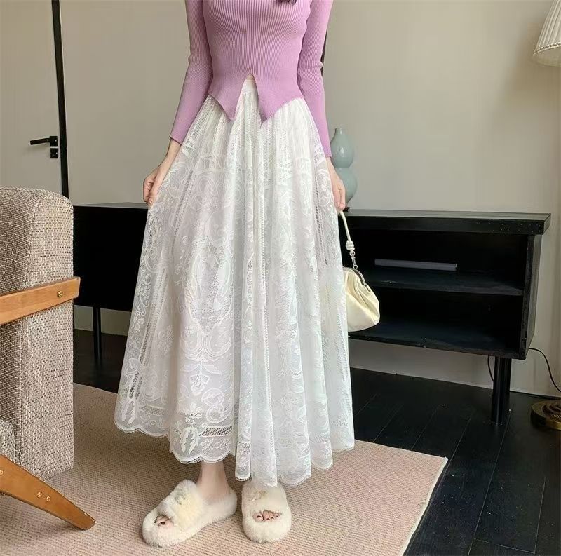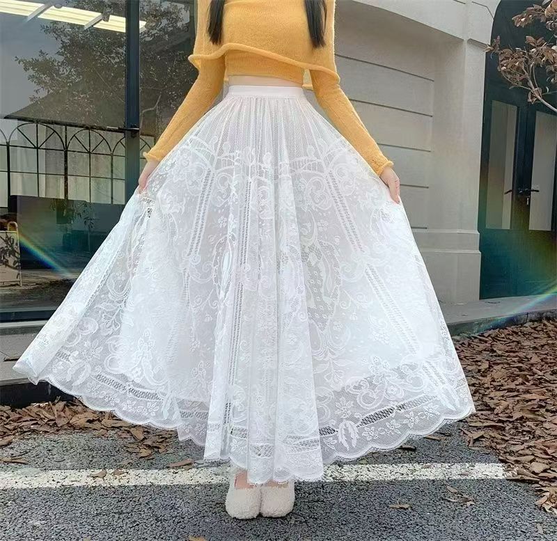 旗袍漢服風ハイウエストメッシュスカート、ロング丈スリムフィット妖精風スカート、レースロングスカート、透かしデザイン