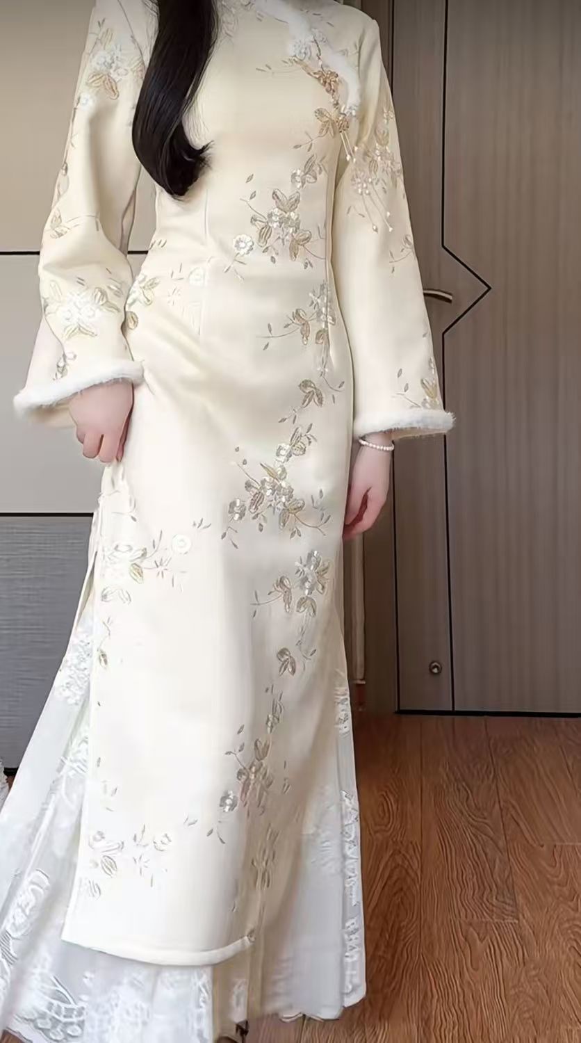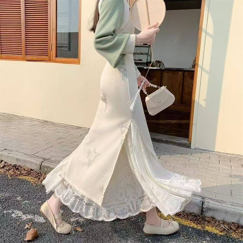 大きいサイズのチャイナドレスの中にレースの半身のスカートを掛けて、中国風のチャイナドレスの洋風の底のスカートを緩めて、股を遮って着痩せしています。