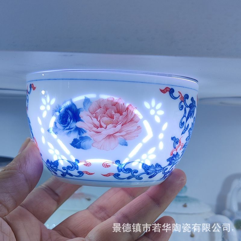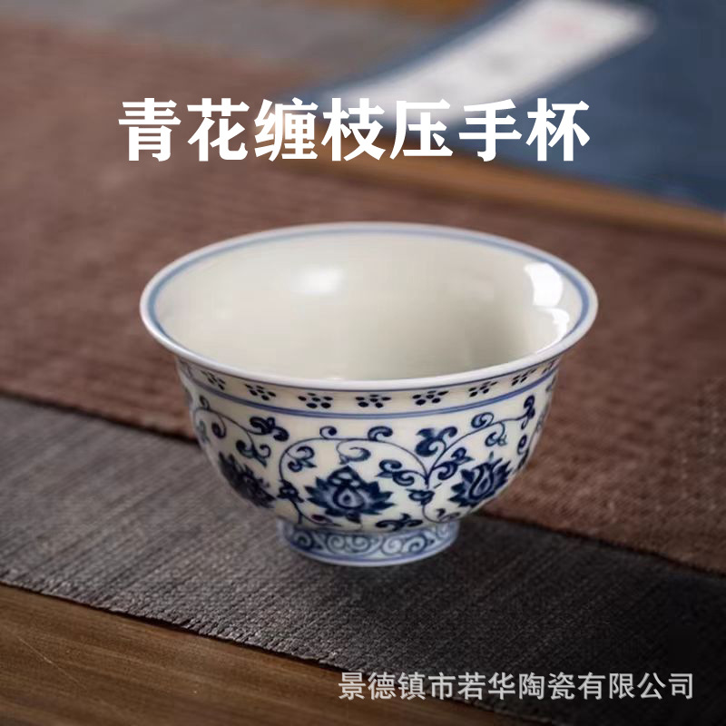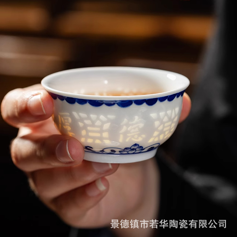 景德镇陶瓷玲珑镂空瓷青花主人杯缠枝牡丹单杯品茗杯茶杯功夫茶具
