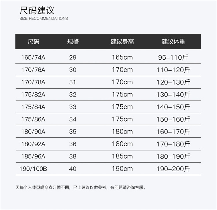 29-おすすめ 47.5-55kg,30-推奨 55-60kg,31-おすすめ 60-65kg,32-推奨 65-70kg,33-推奨 70-75kg,34-推奨 75-80kg,35-推奨 80-85kg,36-推奨 85-90kg,38-推奨 90-95kg,40-推奨 95-100kg