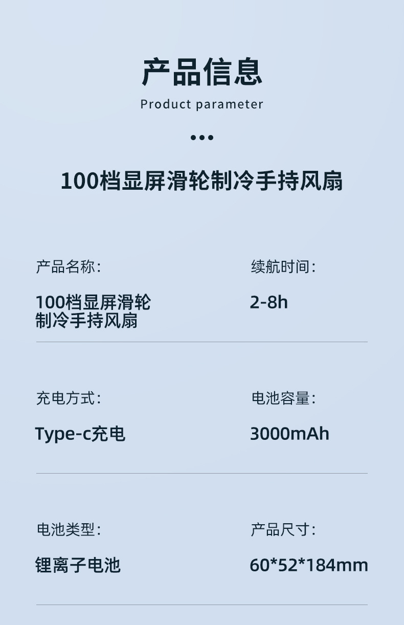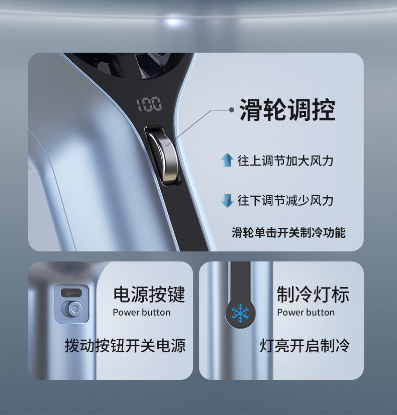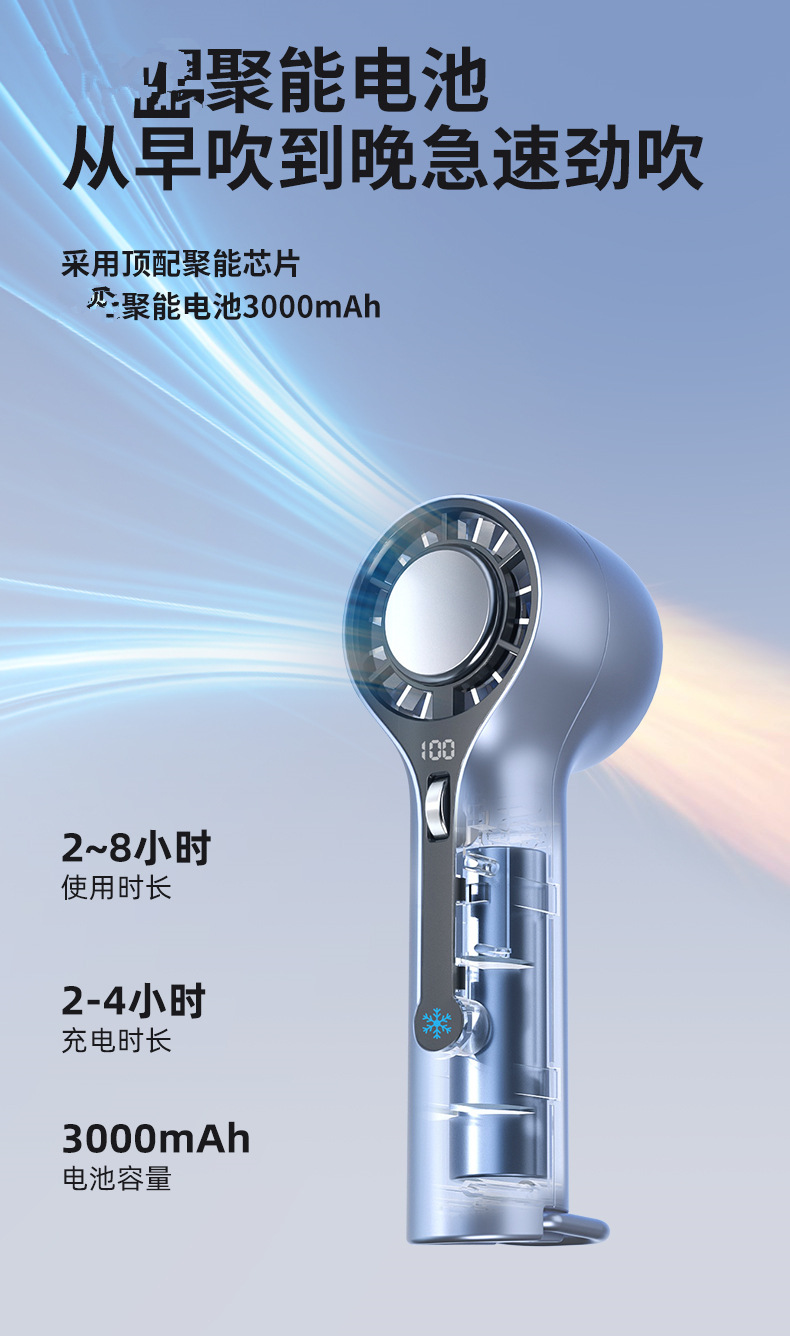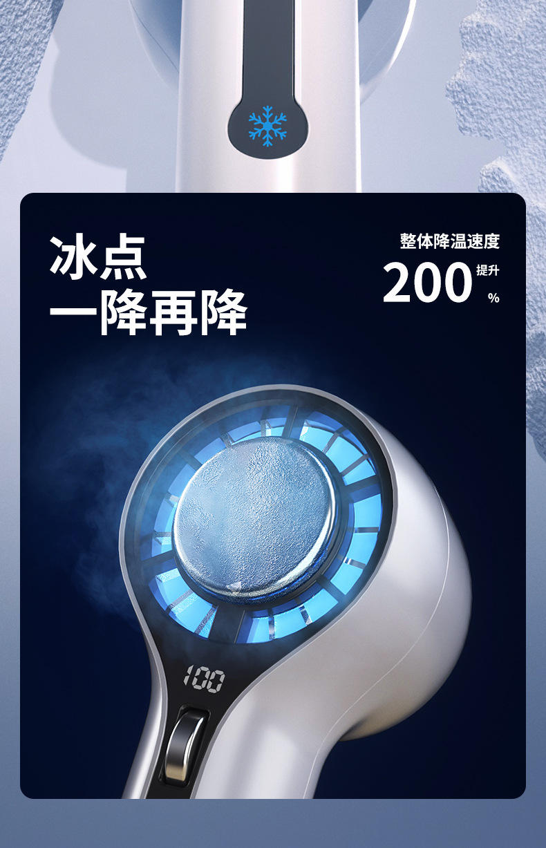 半導体冷却機能、氷湿布冷却、デジタル表示画面、高速ブラシレスモーター、4速風力+冷却、使用時間は約2〜8時間です。
