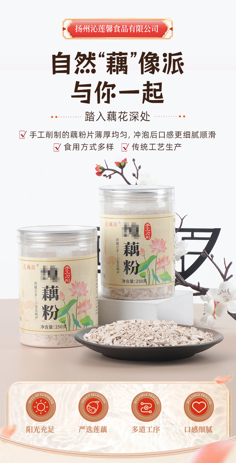 純粋な蓮根粉、手作業で削った蓮根粉、砂糖不使用、農家の手作り、屋台で販売されている蓮根粉、揚州名物、蓮根の故郷。