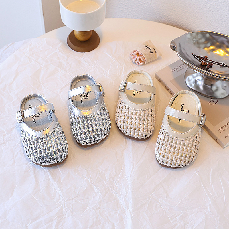 子供のサンダル2025夏の新型の女の子の包頭の王女の靴の女の子は透かし彫りの柔らかい底の滑り止めの学歩の靴を編みます。