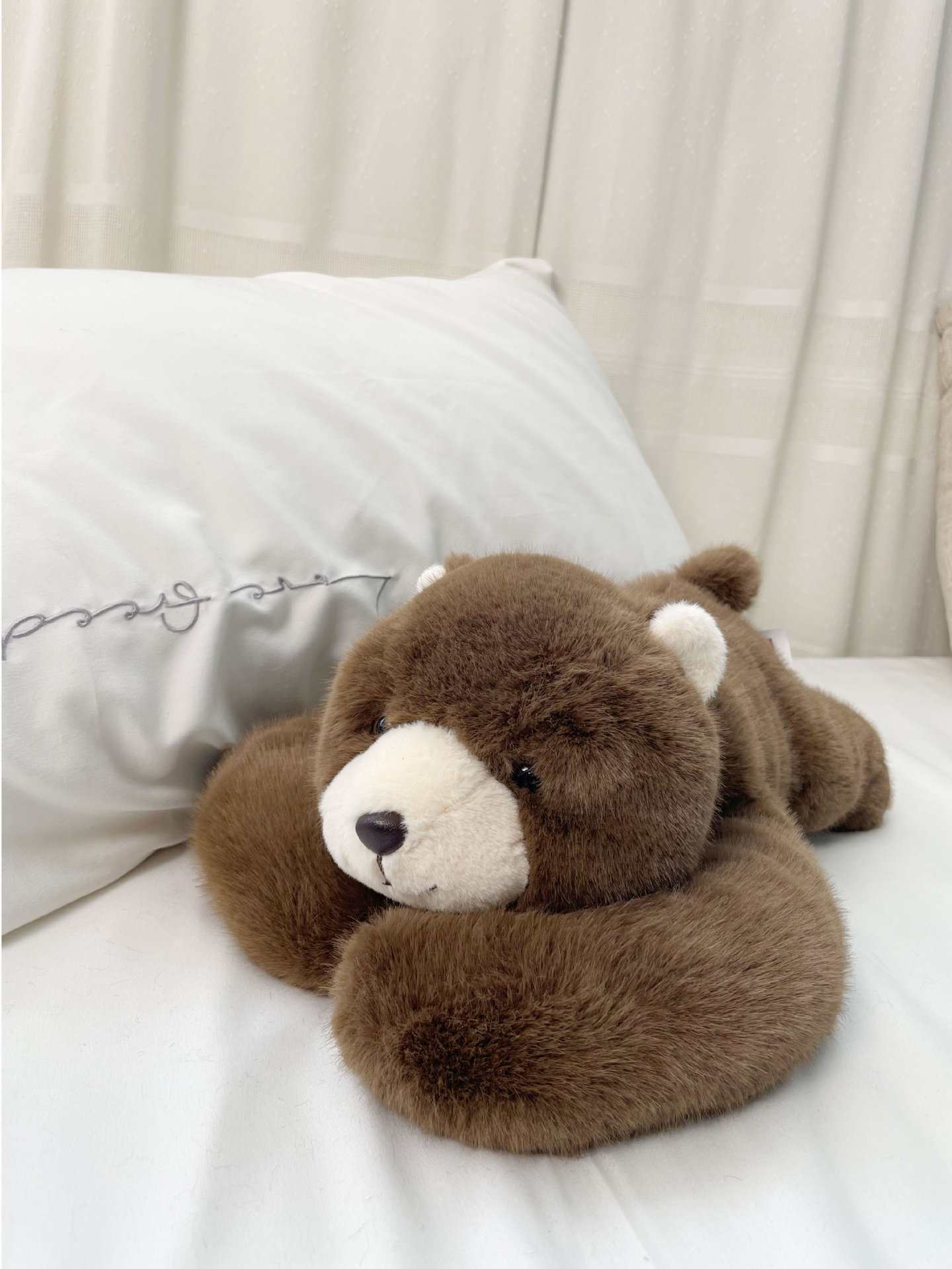 正版は宝安を背にして、うつぶせになります。熊猫は枕を抱いてぬいぐるみを抱いてプレゼントします。