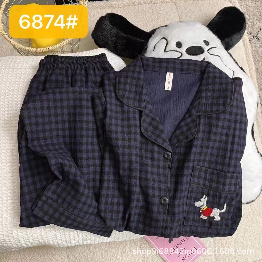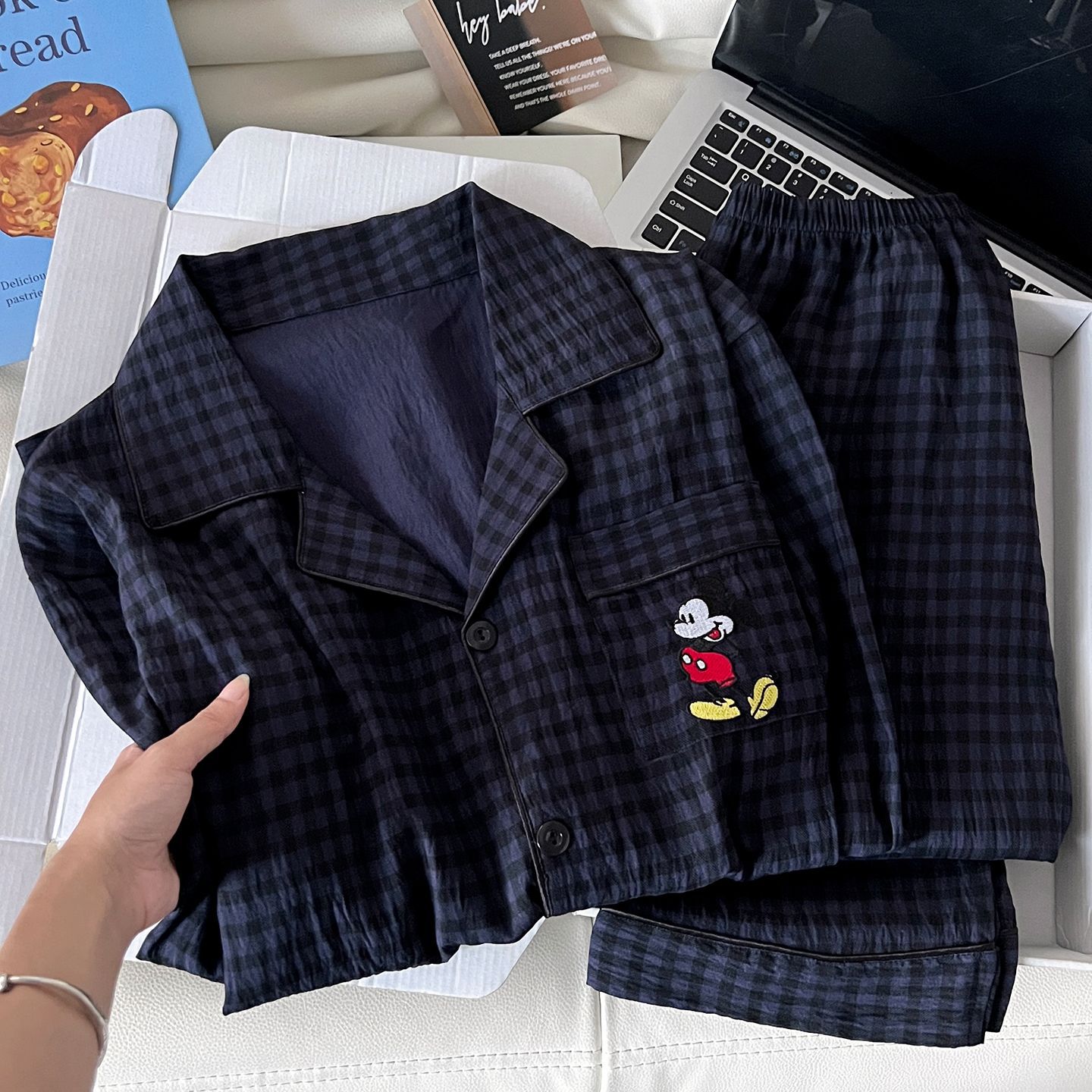 卡通米奇女睡衣夏季云朵棉长袖长裤日系格子简约夏天家居服套装女