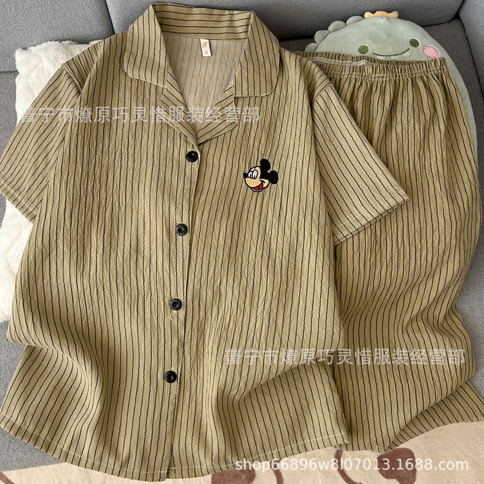 跨境云朵棉长袖长裤刺绣条纹米奇开衫翻领卡通甜美家居服套装女