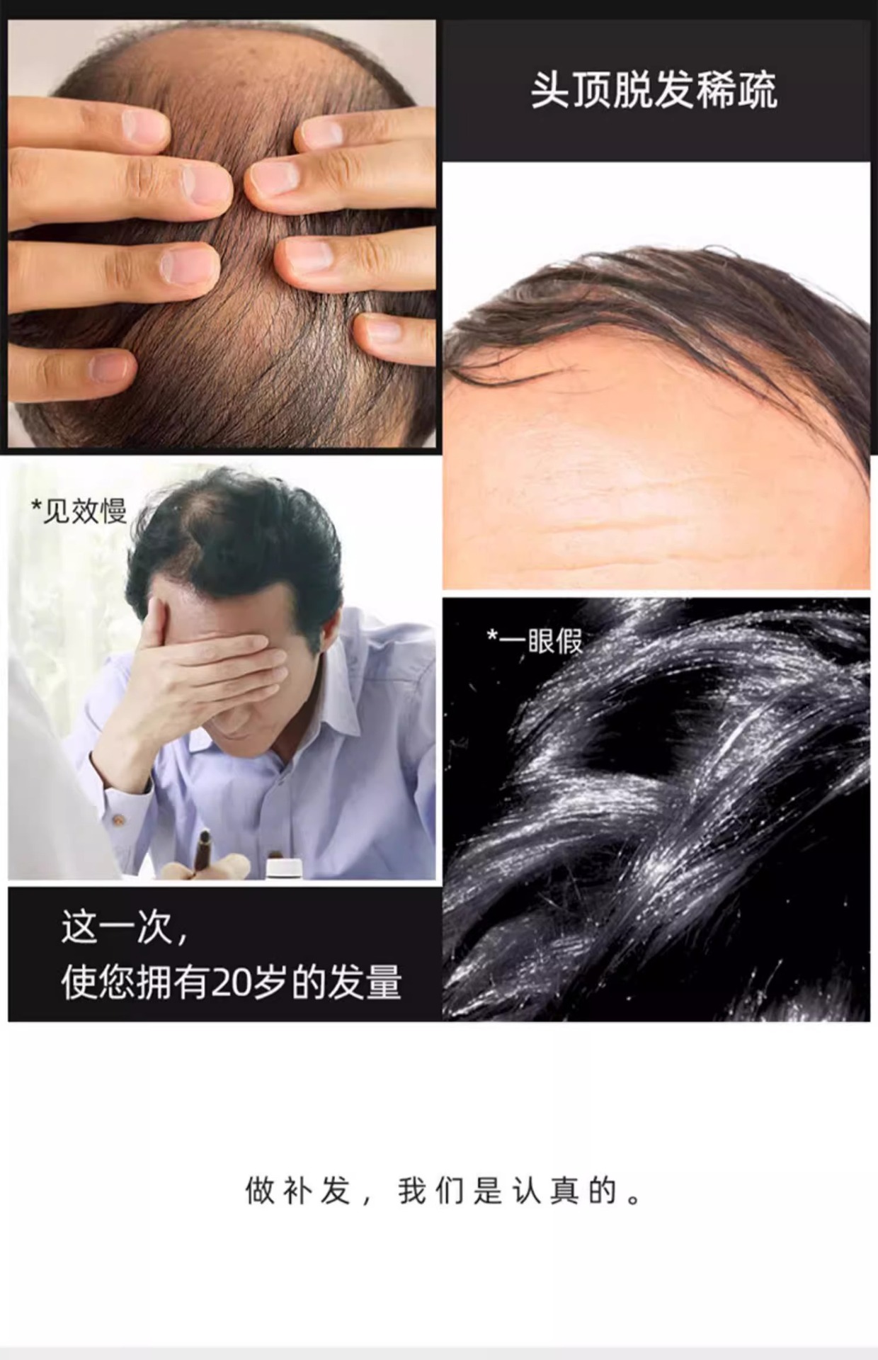前頭部に跡が残らないドイツ製糸を使用した、男性用かつら。頭皮を模倣した補毛ピース。