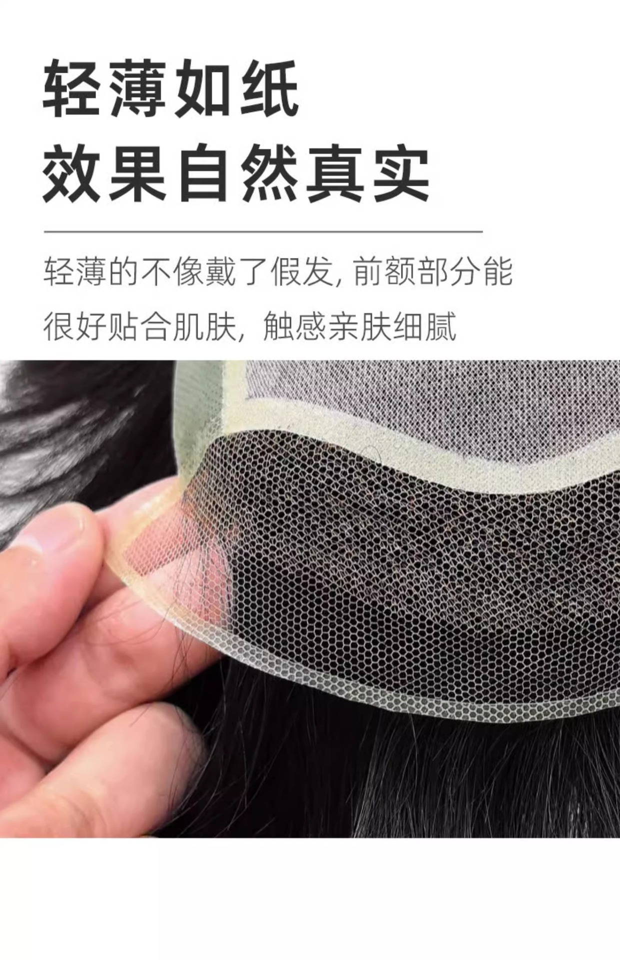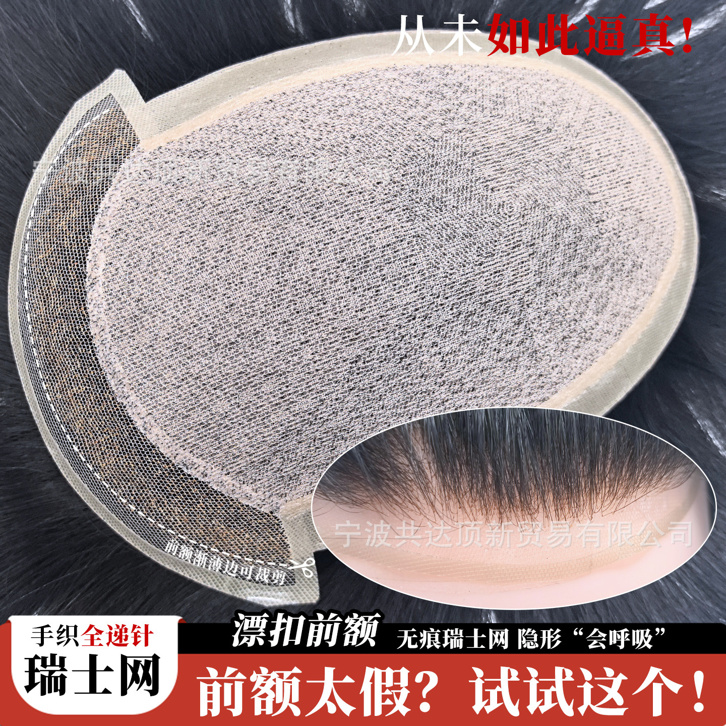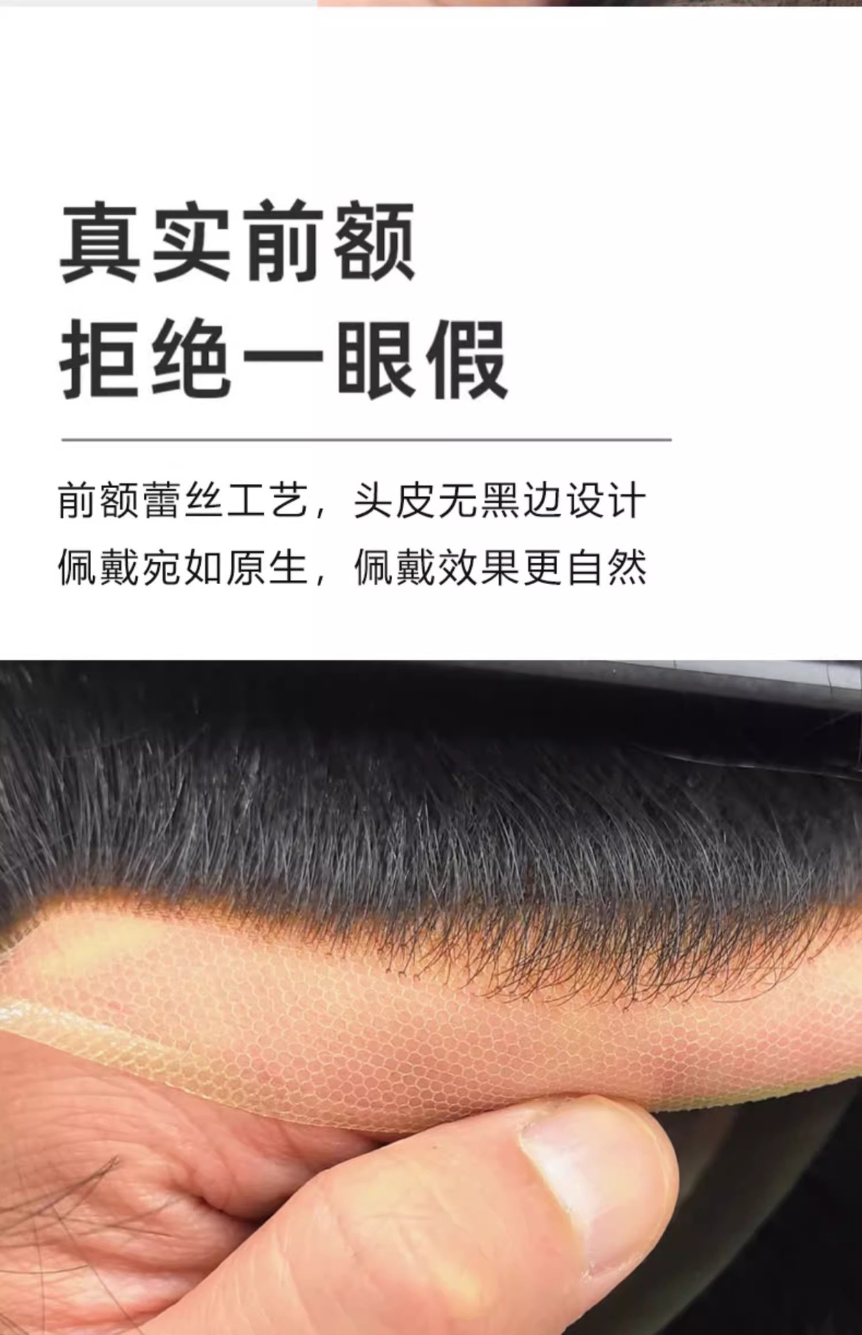 瑞士网双递针男士假发高端轻薄透气手织钩织前额蕾丝真人发补发块