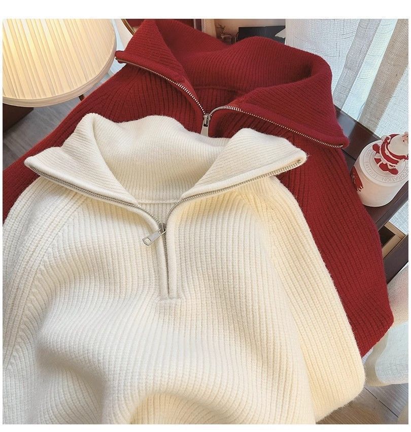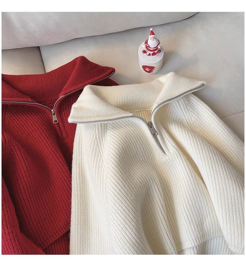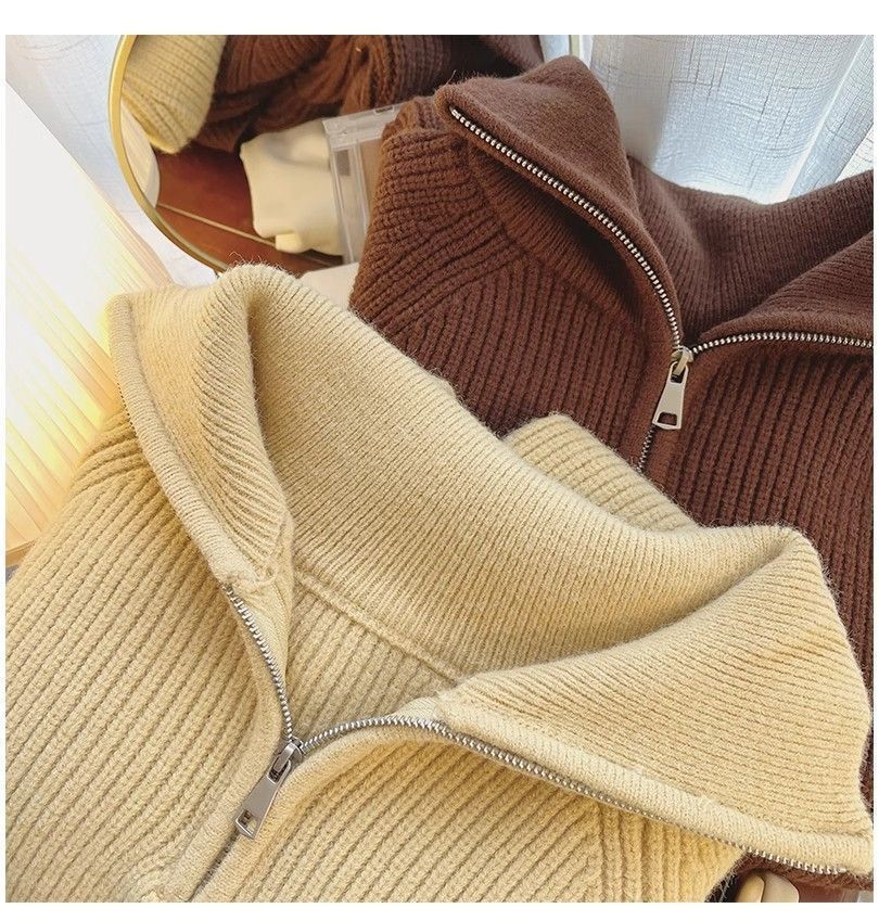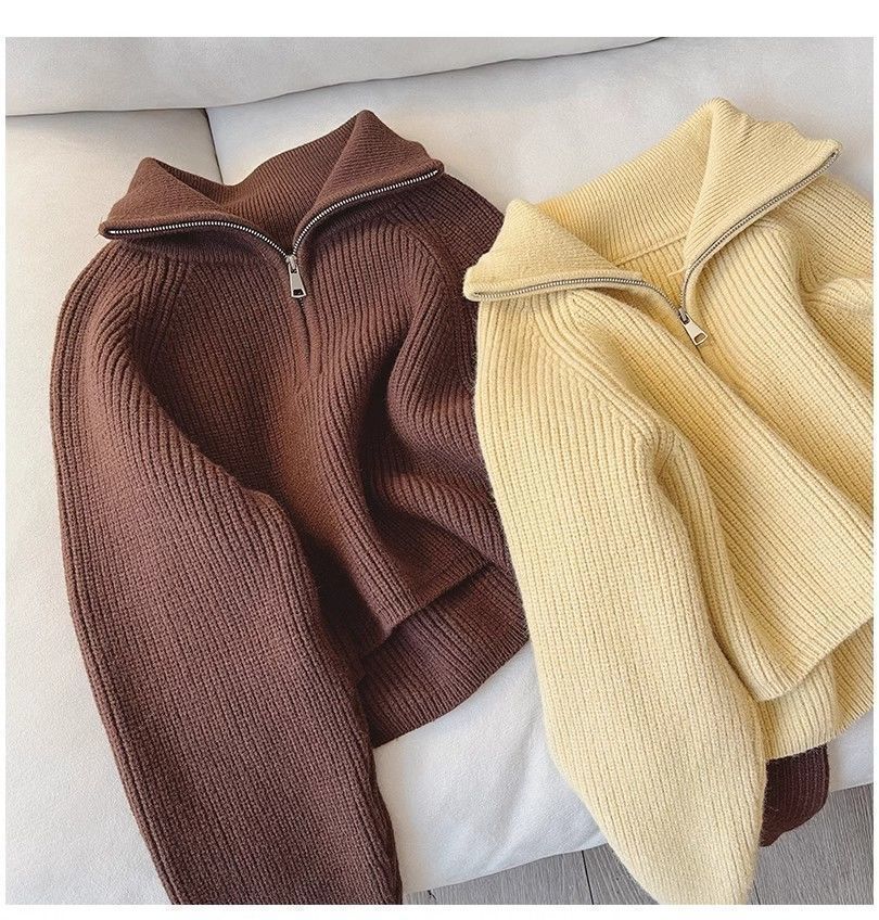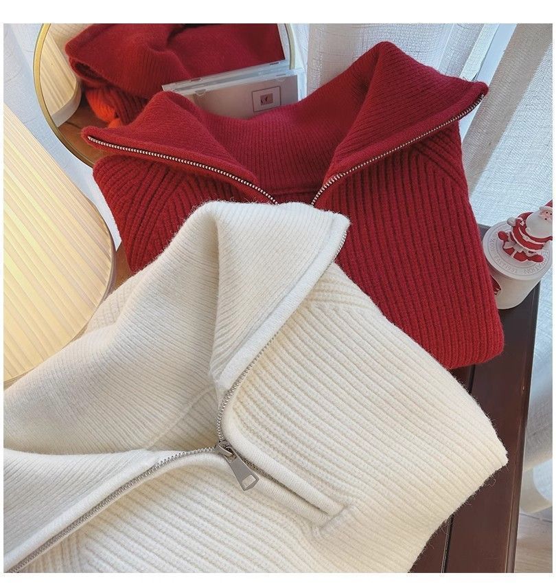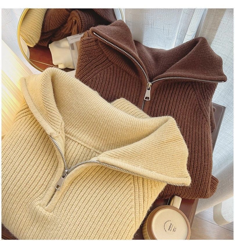 厚みのあるニット 2025 秋冬の新しい年齢を減らすデザインのジッパールーズスリミングラペルレイジーセータートップ女性用