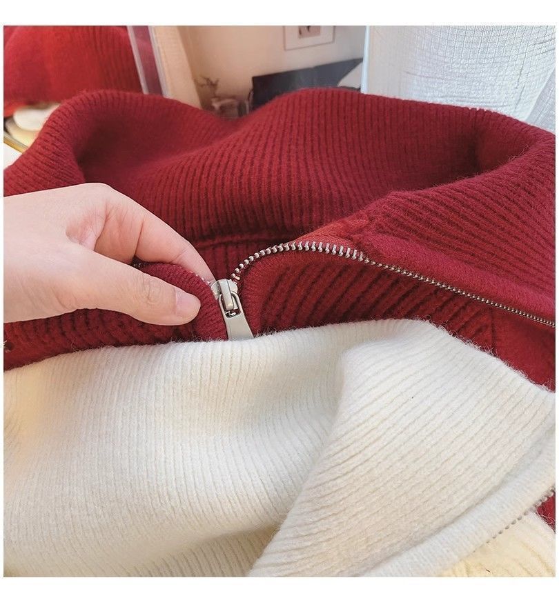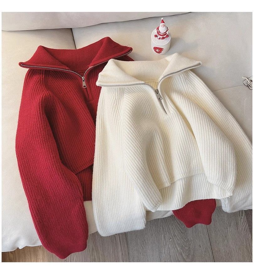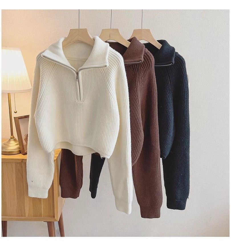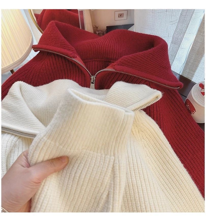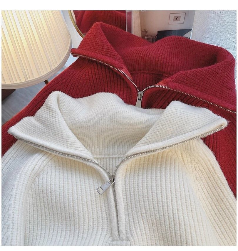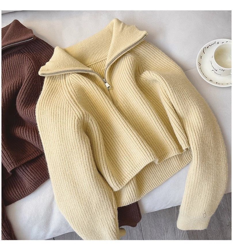 厚みのあるニット 2025 秋冬の新しい年齢を減らすデザインのジッパールーズスリミングラペルレイジーセータートップ女性用