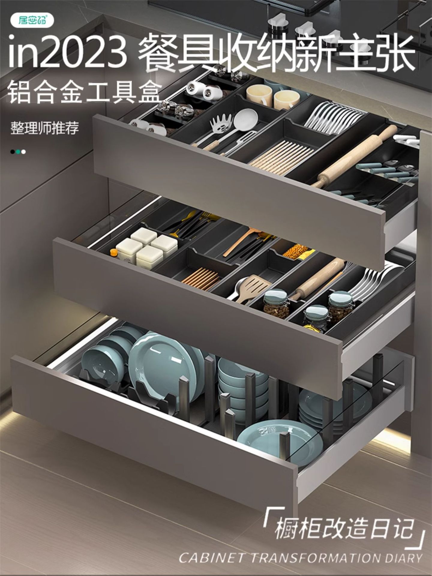 宇宙アルミ製引き出し収納仕切りキャビネット内蔵カトラリー収納ボックス、キッチン整理整頓ツール