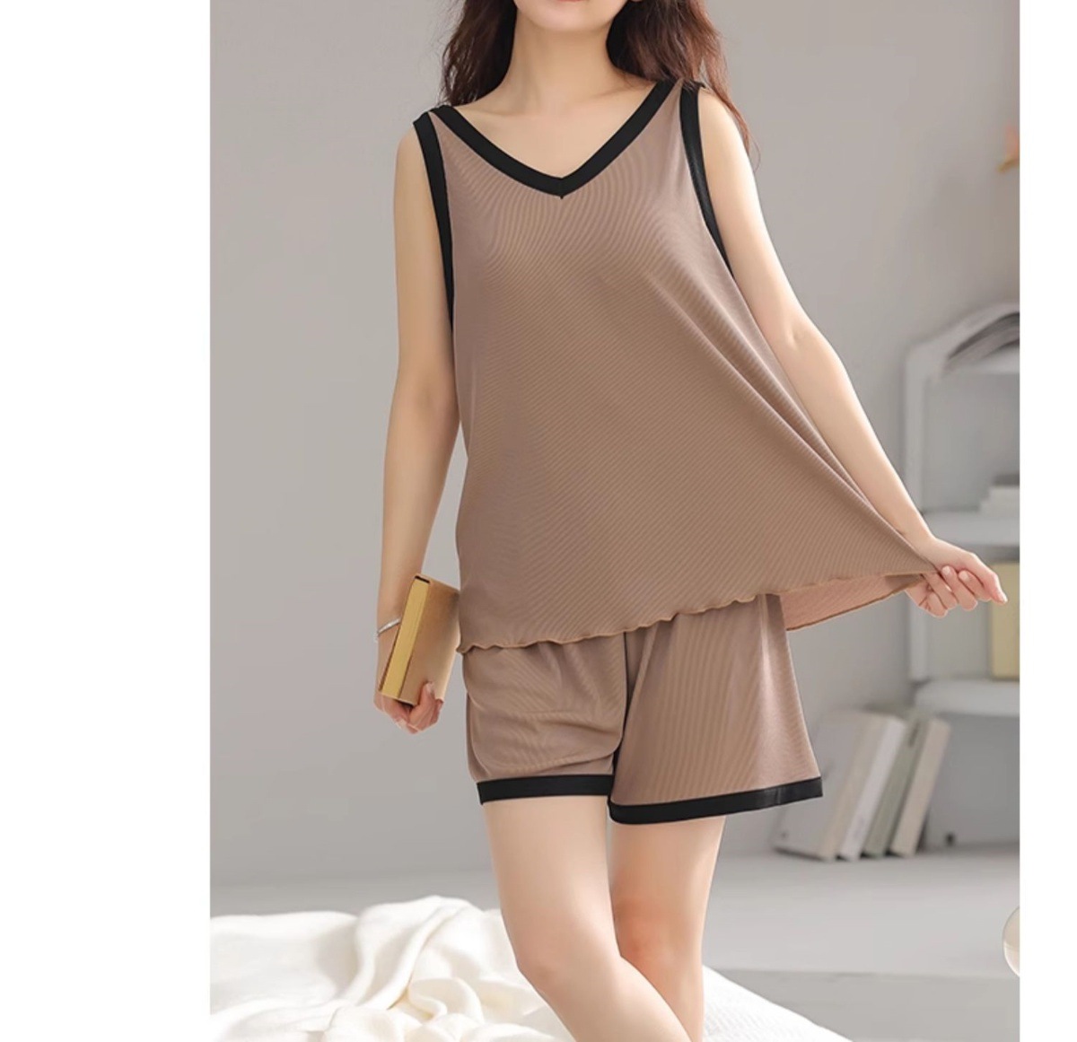 パジャマセットモーデール夏シーズンタイプ胸パッド付き女性の家の小衆は袖なしの純色のシンプルな家の服を着ることができます。